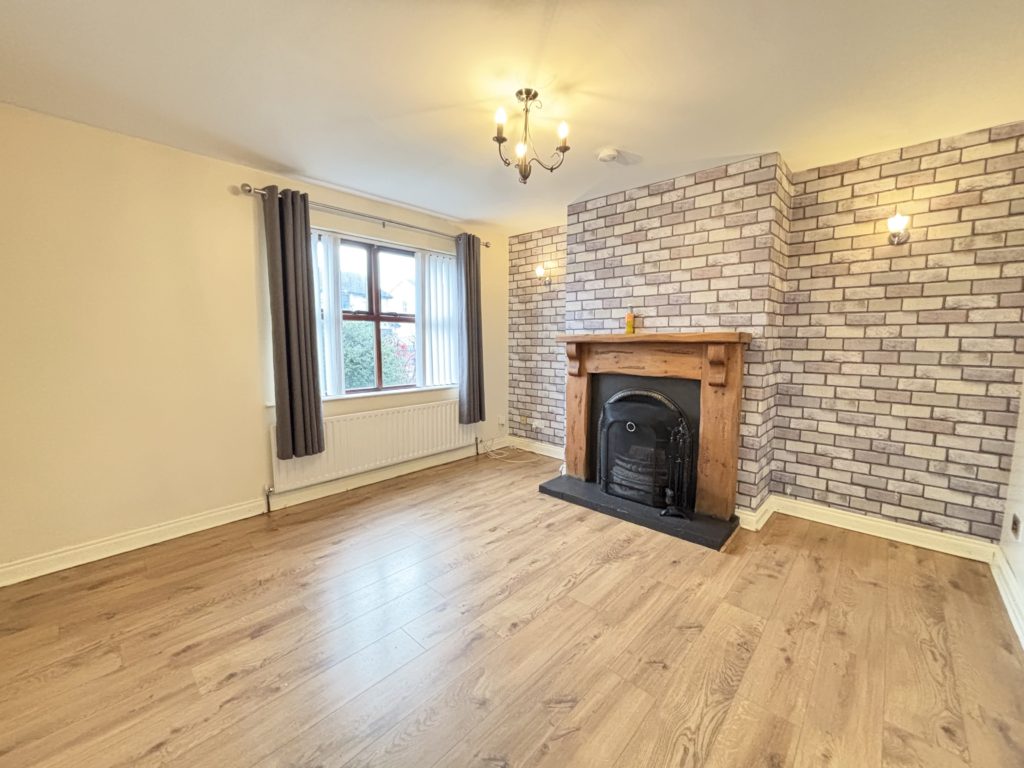 Lounge 4.10m x 3.90m (13‘6” x 12‘10”) :- Laminate wooden flooring. Adam style fireplace with tiled inset and hearth with solid wooden surround. Recess lighting.