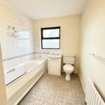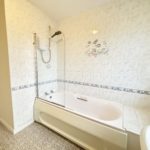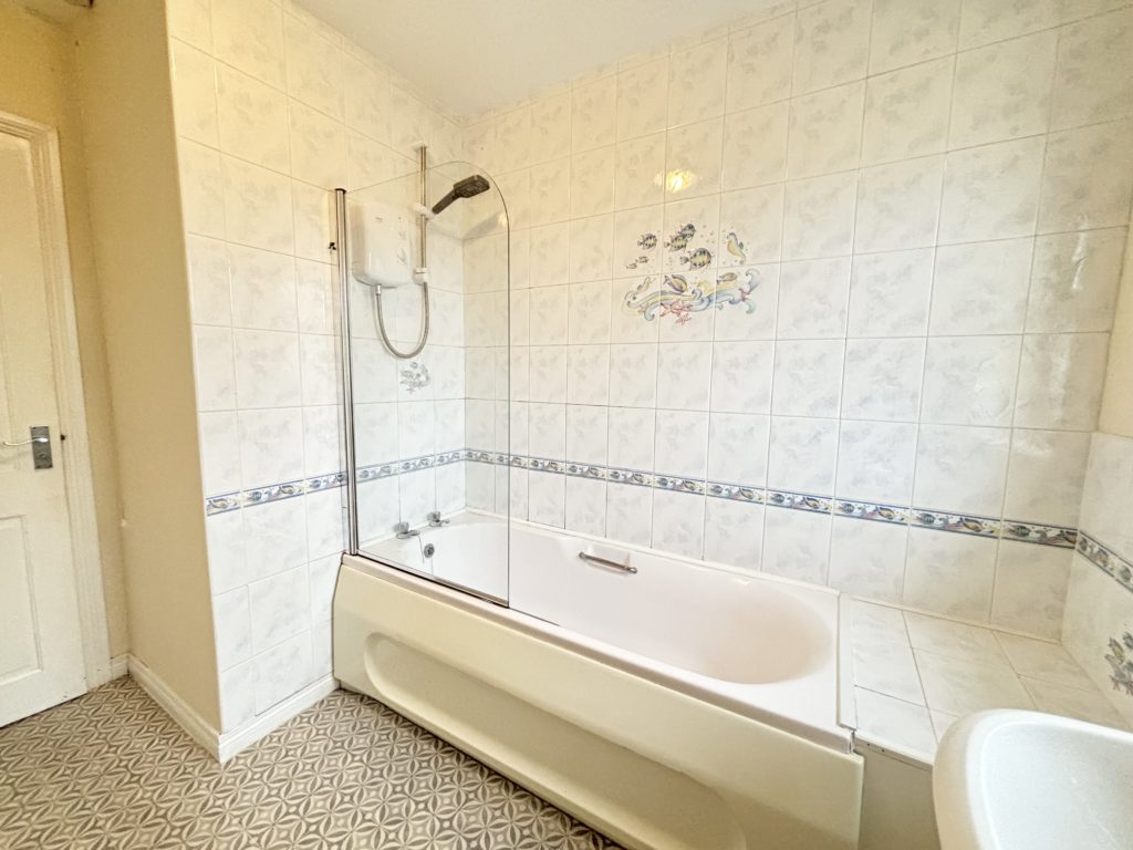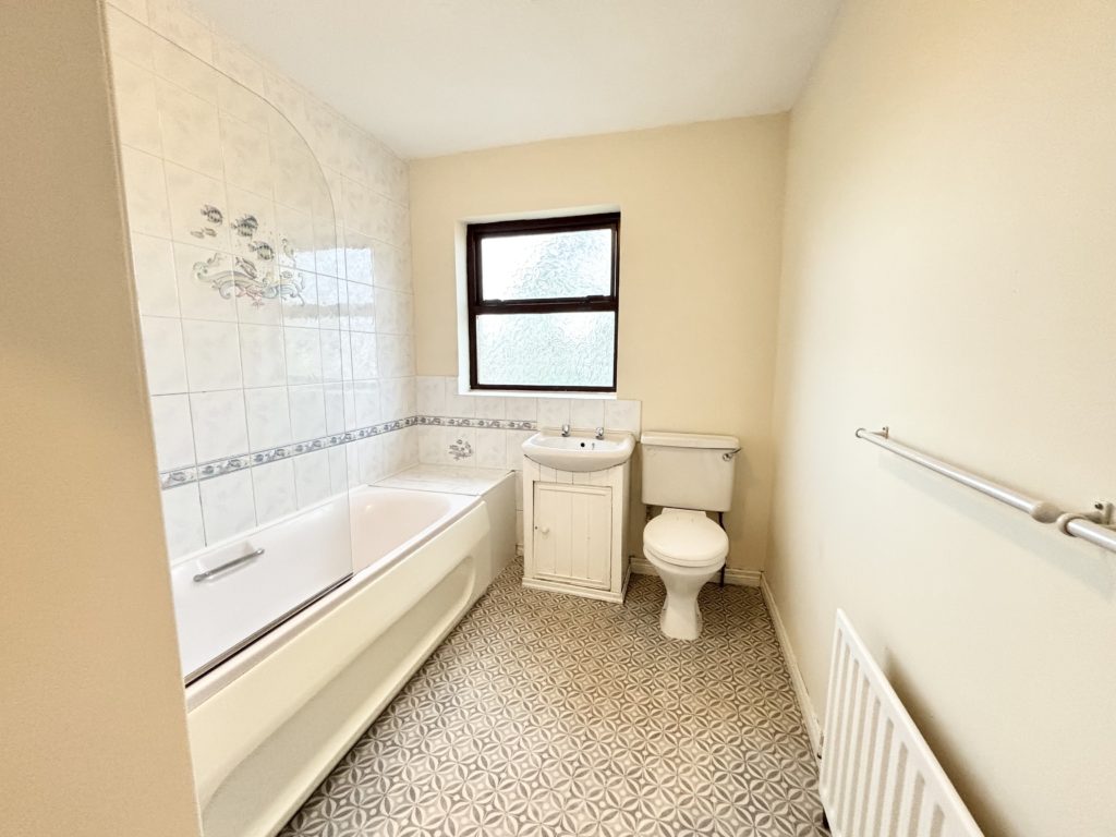 Bathroom 3.00m x 2.10m (9‘10” x 6‘11”) :- White three piece suite comprising lfwc, vanity whb and bath with shower above. Part tiled to walls. Vinyl floor. Towel rail.