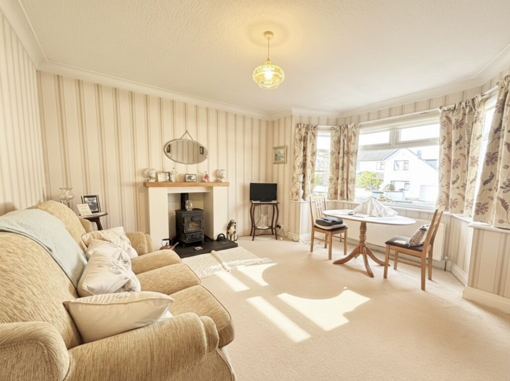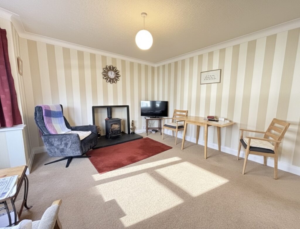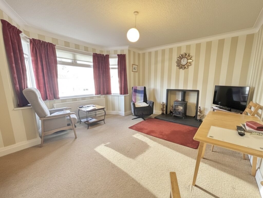 Lounge 4.8m x 4.0m (15‘9” x 13‘1”) :- Feature bay window. Wood burning stove unit with tiled hearth. Carpet laid.
