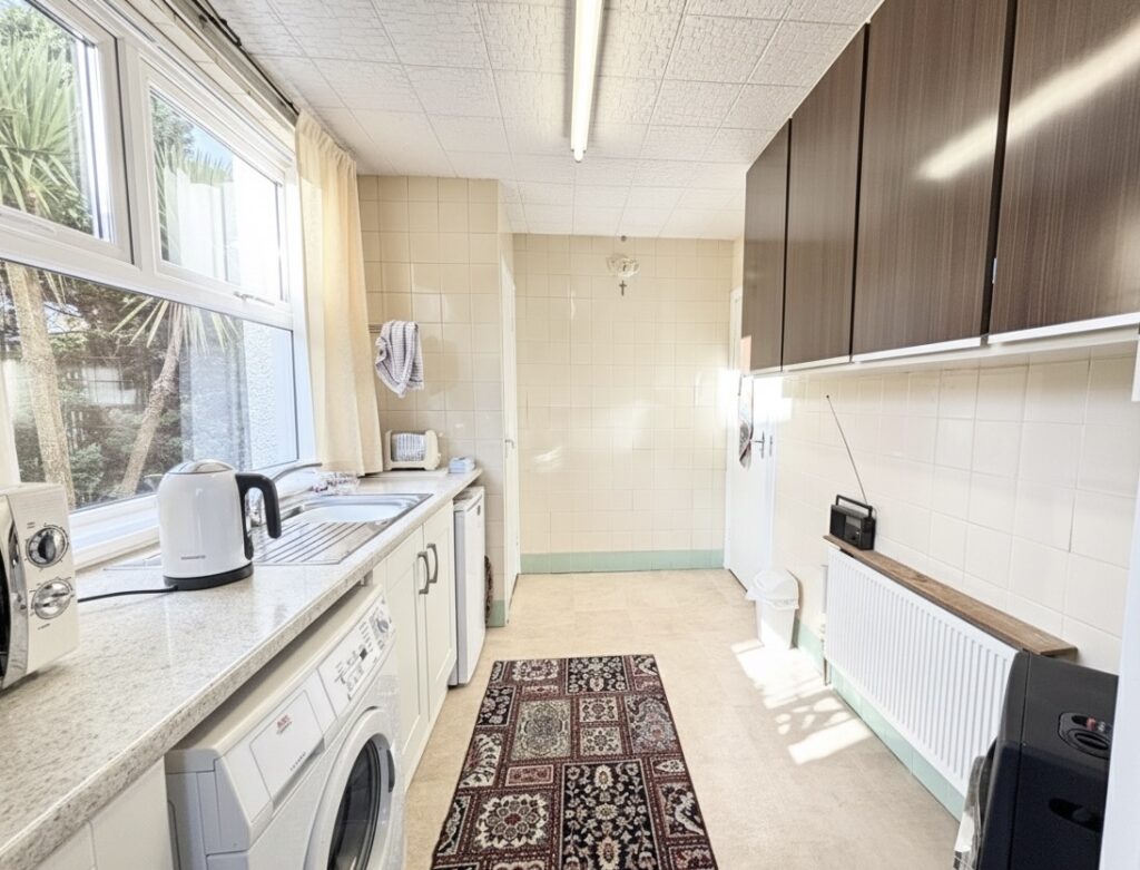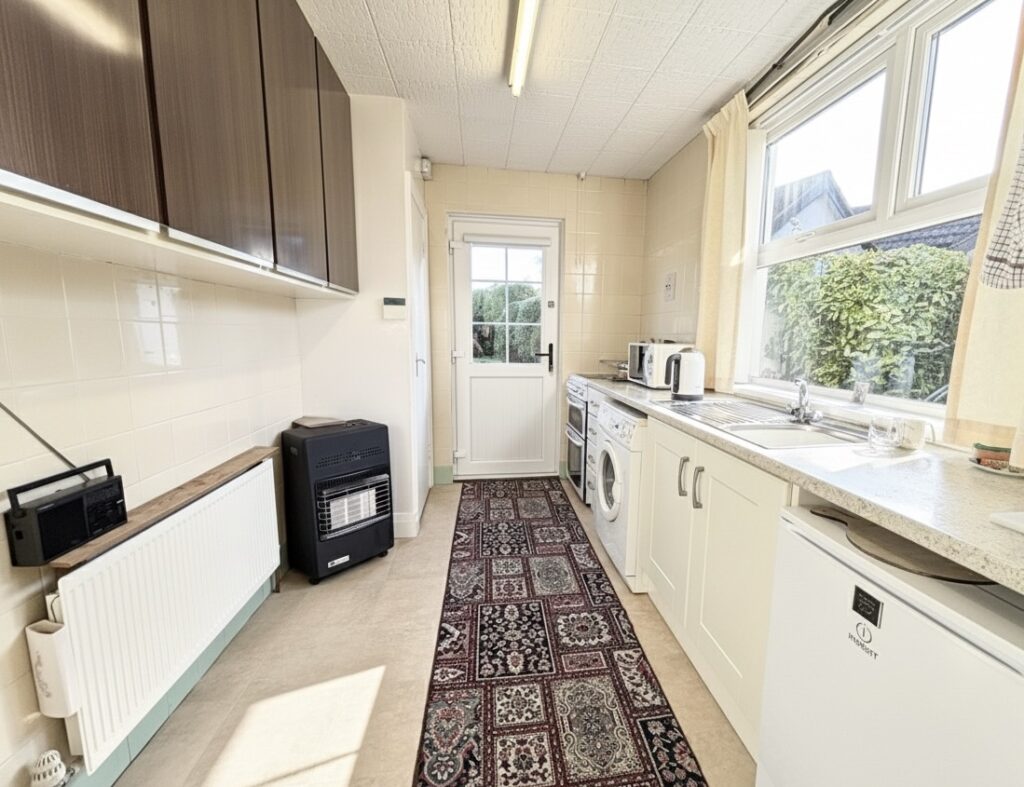 Kitchen 4.2m x 2.44m (13’9″ x 8‘0”) :- Range of eye and low level units. One and a quarter bowl stainless steel sink unit and drainer. Space for hob and oven. Plumbed for washing machine. Built in storage cupboard. Fully tiled to walls. Space for undercounter fridge. Laminate vinyl non slip flooring.
