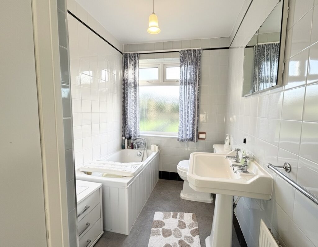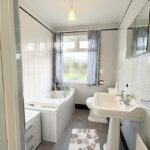 Bathroom 3.37m x 1.8m (11’1’’ x 5’11’’) :- Includes white three piece suite comprising lfwc, whb and bath. Laminate vinyl tile effect non slip flooring. Hotpress off. Tiled walls.