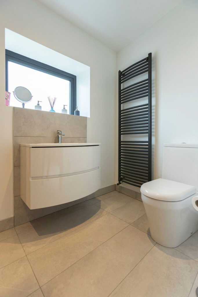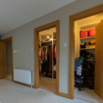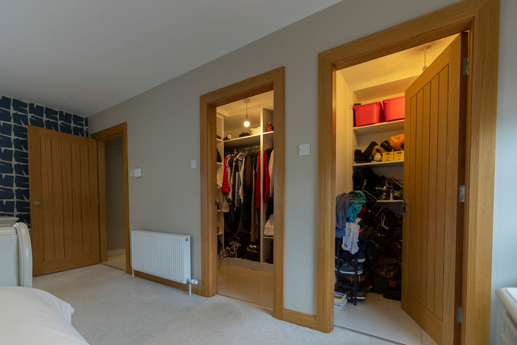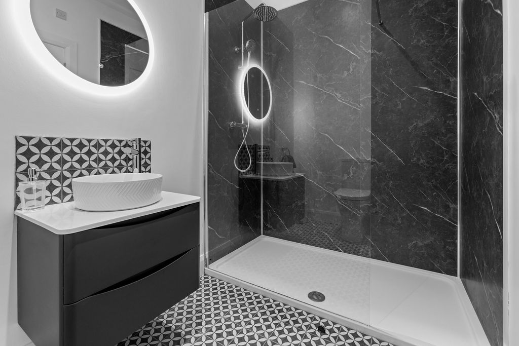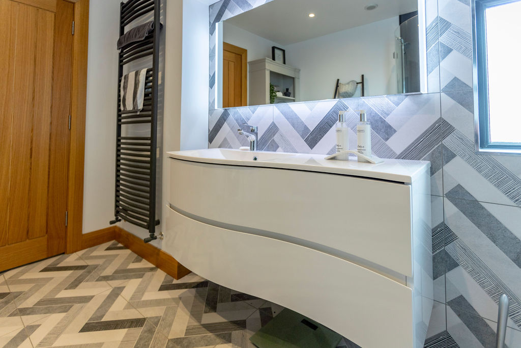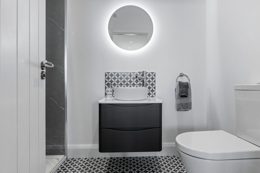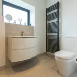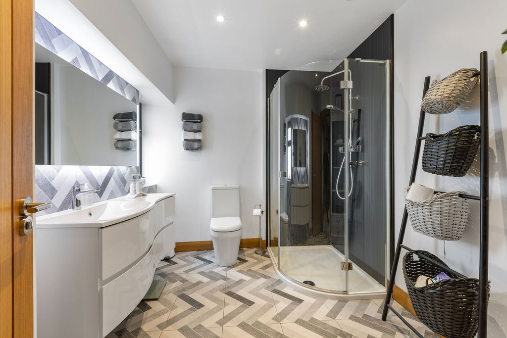 Shower room 2.14m x 1.83m (7’0″ x 6’0″) :- Contemporary suite includes white lfwc and wall mounted vanity whb with chrome accessories. Blue tooth and WIFI connected light up mirror. Panelled double quadrant shower cubicle with rain shower head and separate attachment. Anthracite heated towel rail. Tiled flooring. Spotlights.