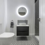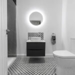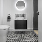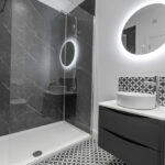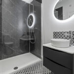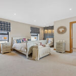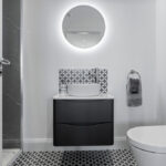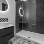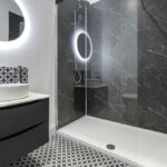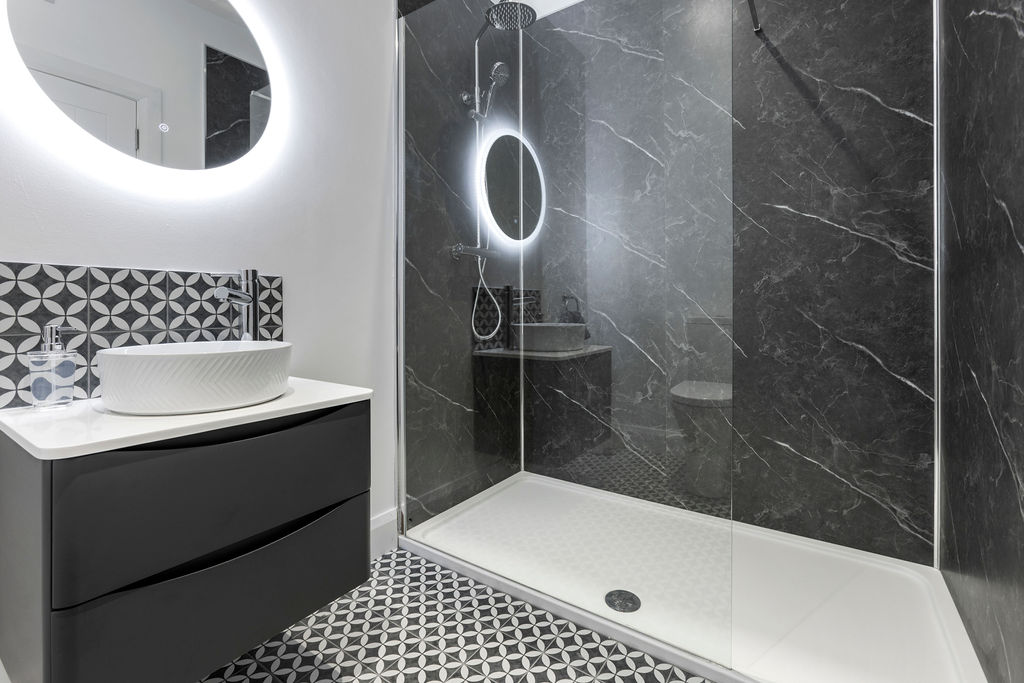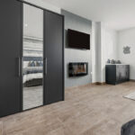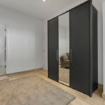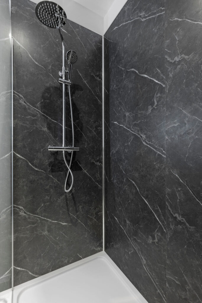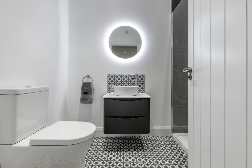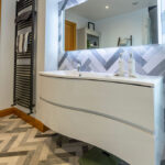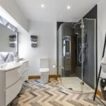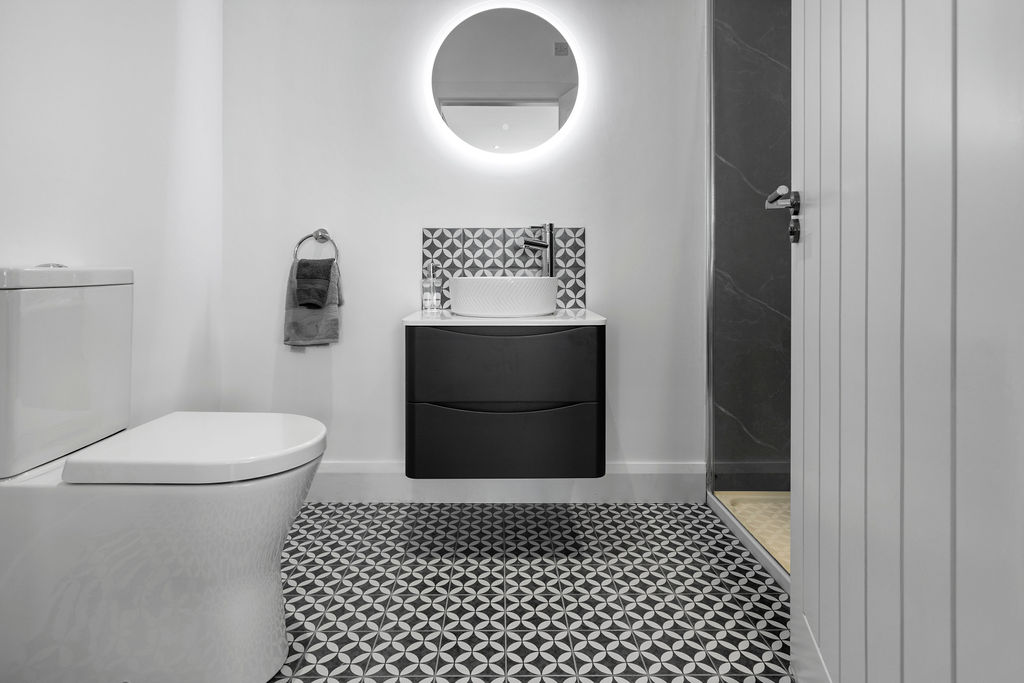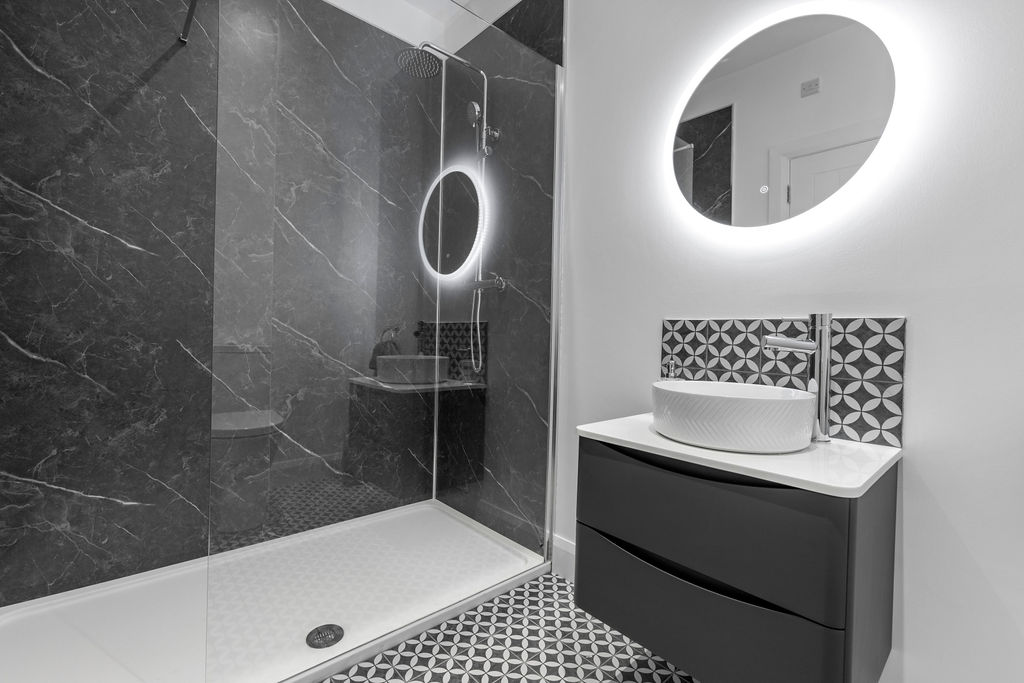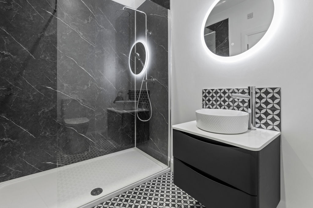 Shower room 2.14m x 1.83m (7’0″ x 6’0″) :- Contemporary suite includes white lfwc and wall mounted vanity whb with chrome accessories. Blue tooth and WIFI connected light up mirror. Panelled double quadrant shower cubicle with rain shower head and separate attachment. Anthracite heated towel rail. Tiled flooring. Spotlights.