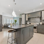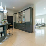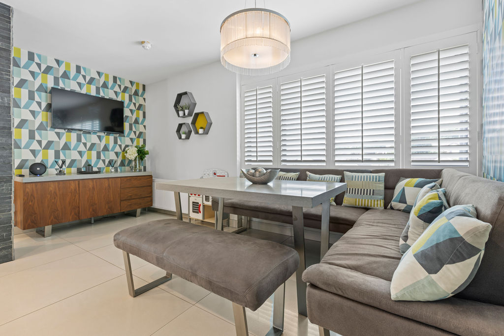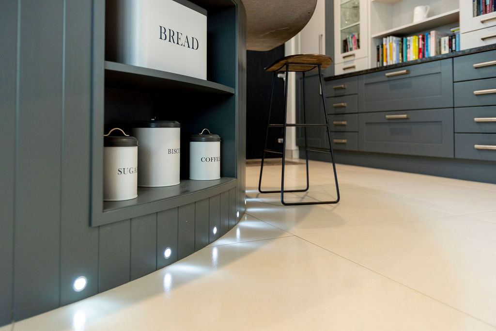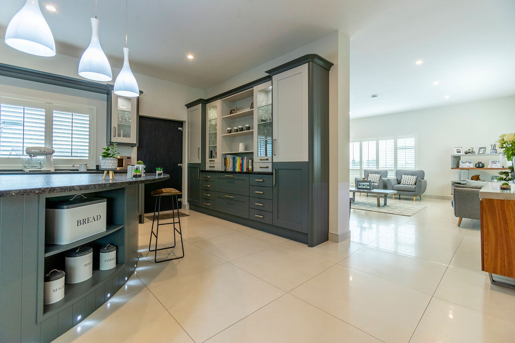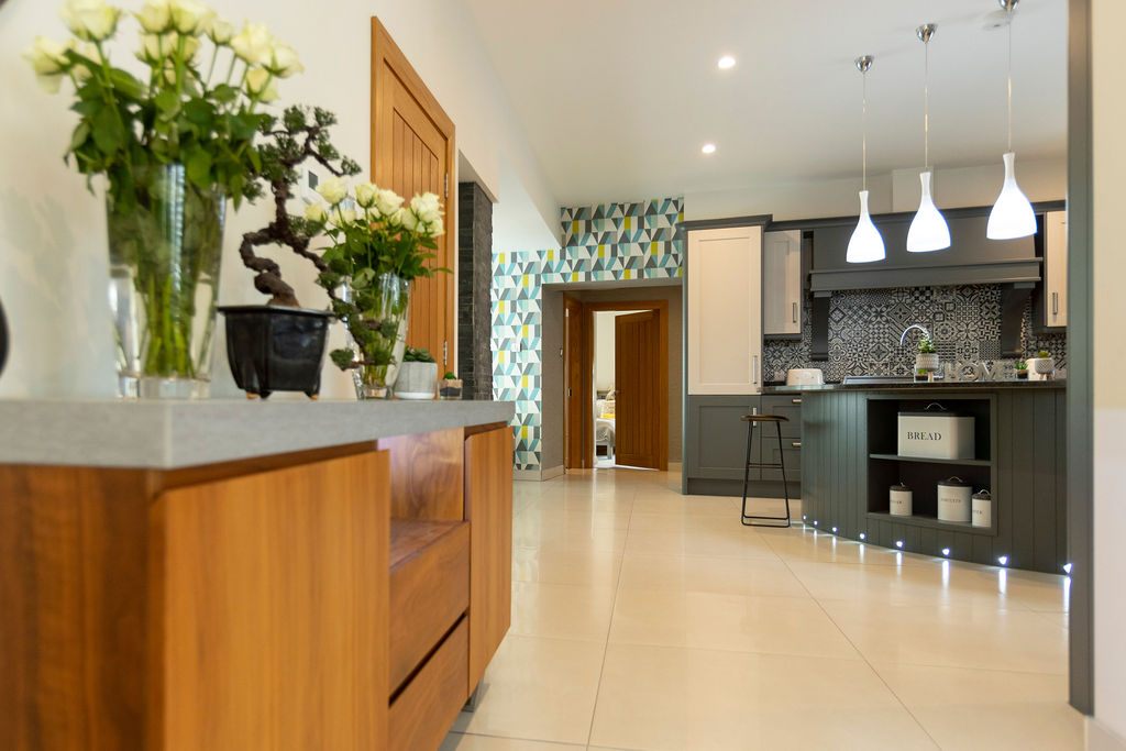 Open plan Lounge/Dining/Kitchen :- Tiled flooring and up-stands. Spotlights.