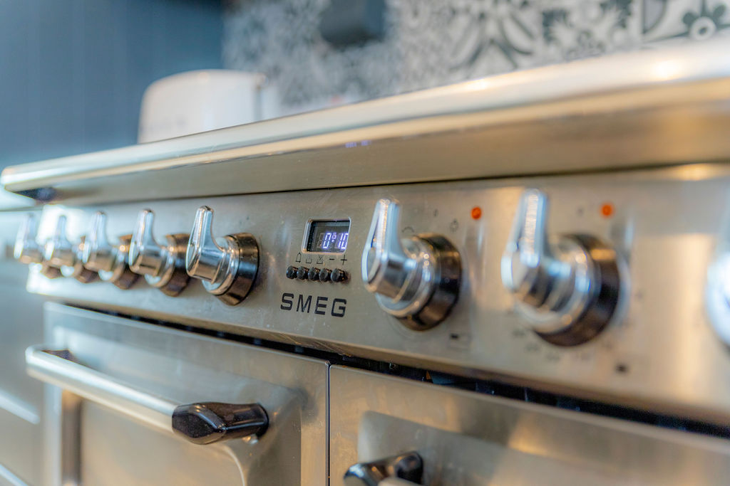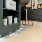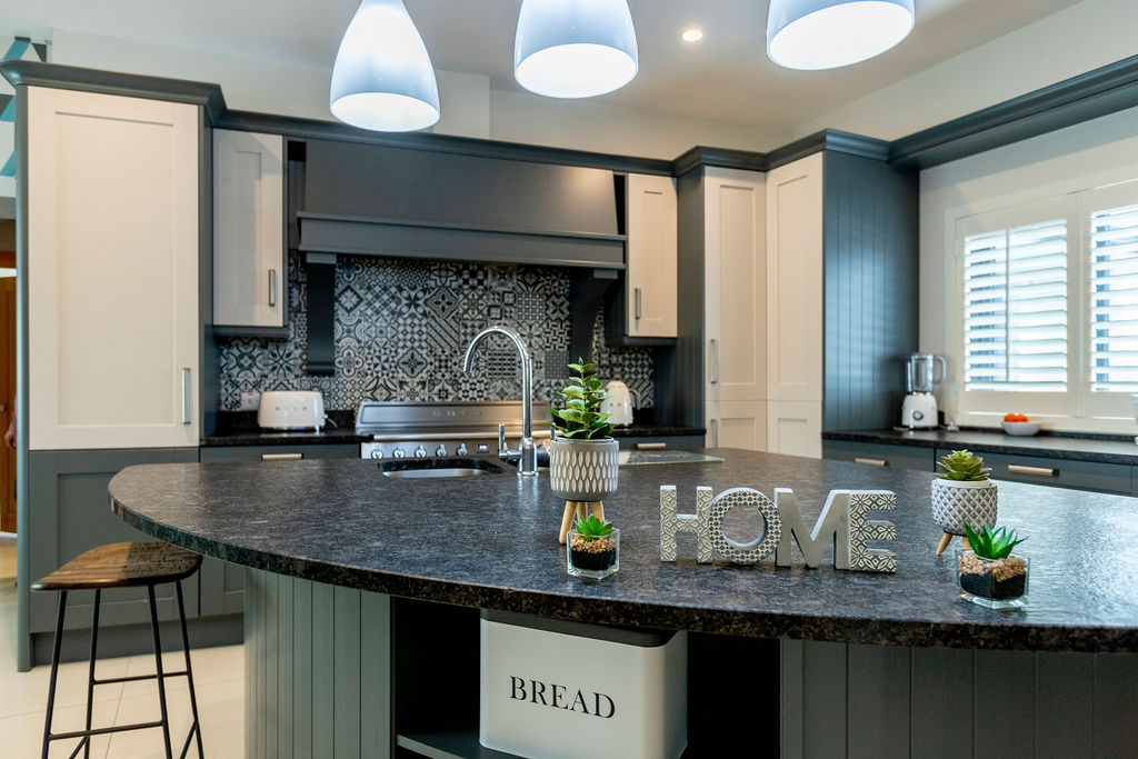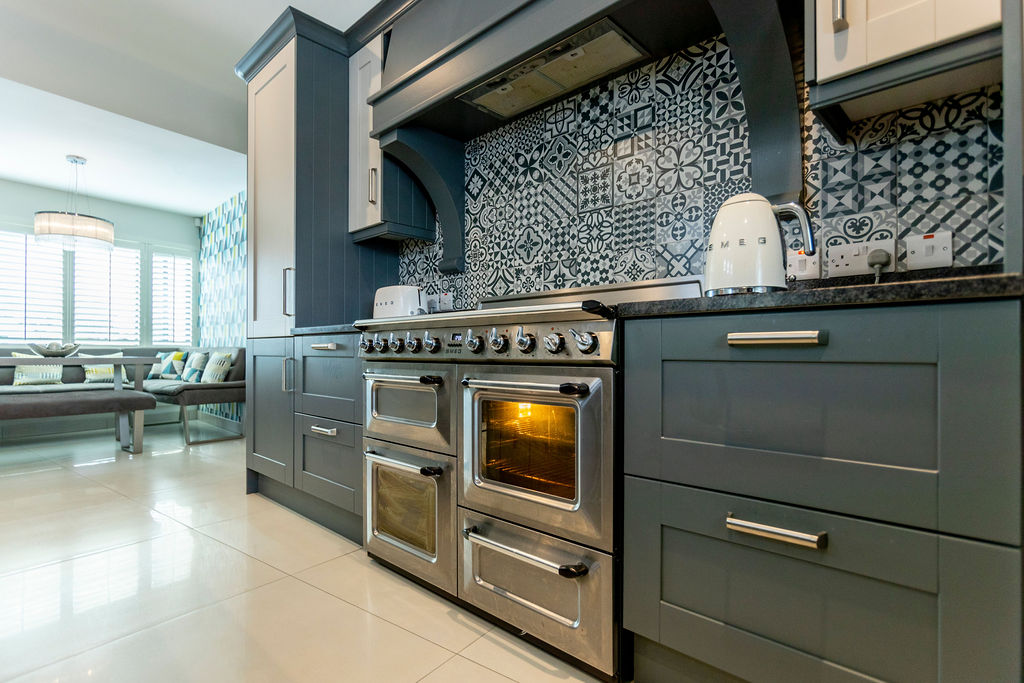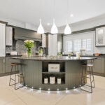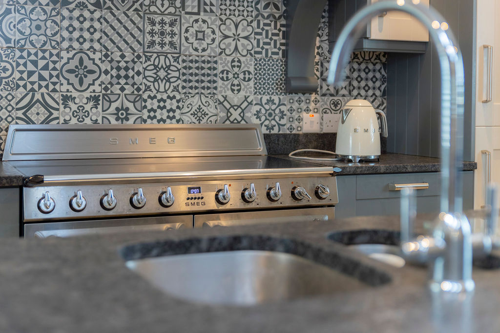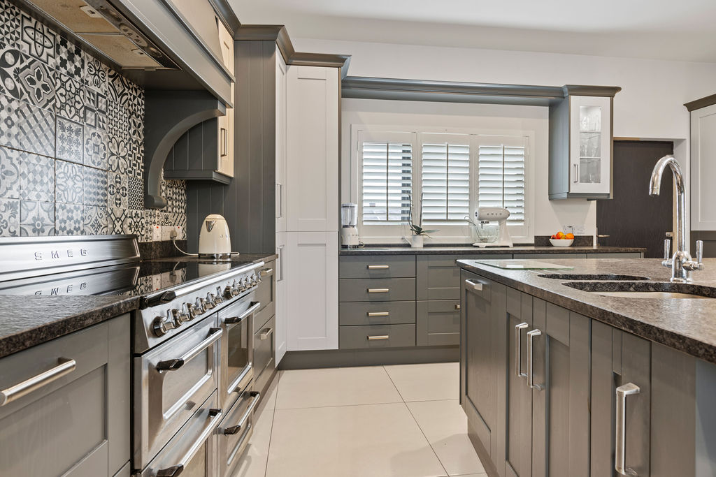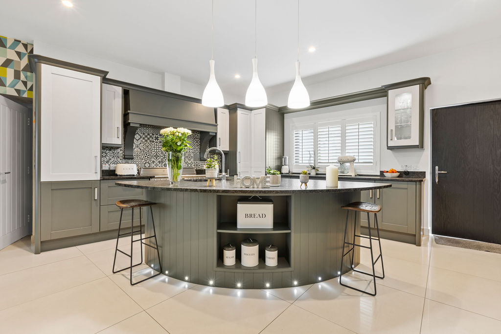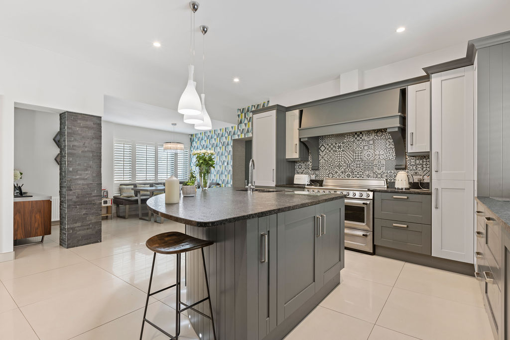 Kitchen 5.27m x 3.69m (17’3” x 12’1”) :- Includes range of bespoke Shaker style units in contrasting Graphite and Cornforth White with chrome and glass displays. Quarter moon shaped island unit with 1 ¼ sunken sink units and granite effect worktops. Integrated washing machine and dishwasher. LED lighting to kickboards. Granite effect worktops and up-stands to rest. Smeg oven unit with extractor fan. Fly-over above window. Integrated fridge/freezer and tumble dryer.