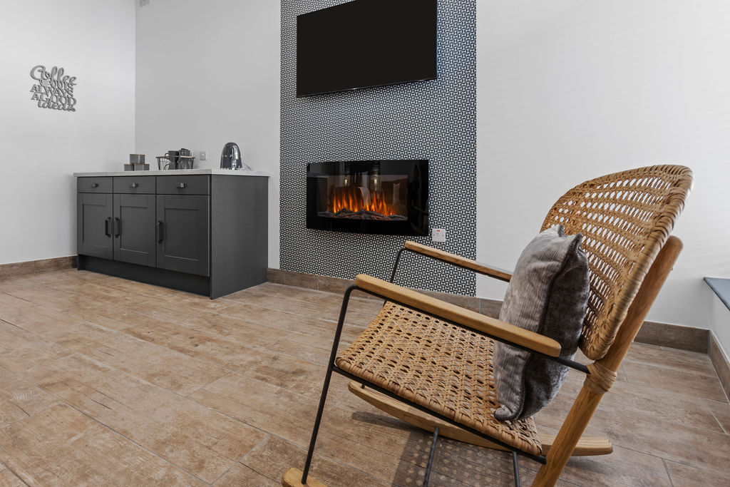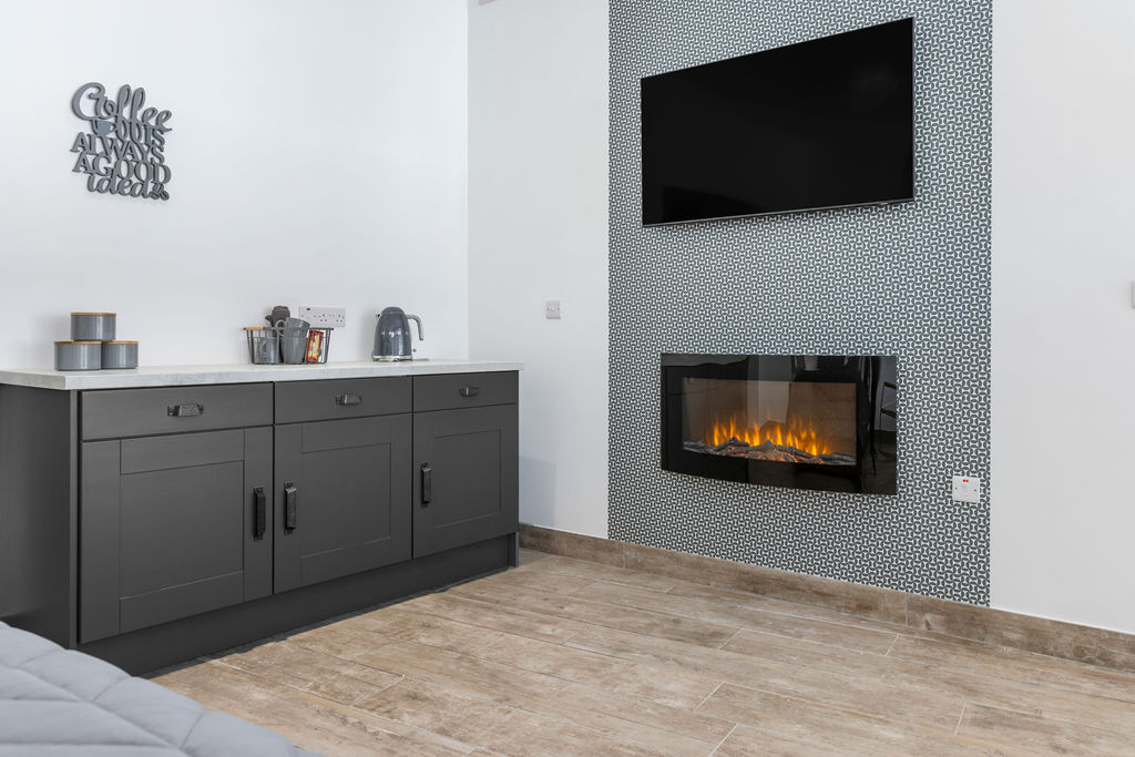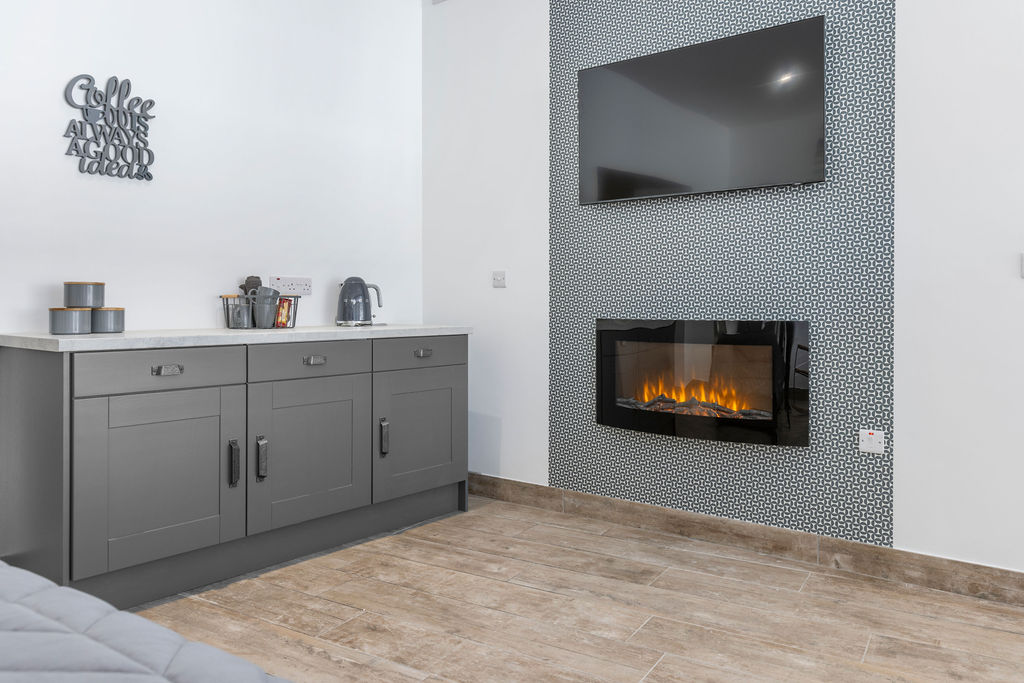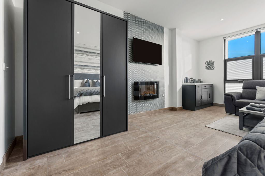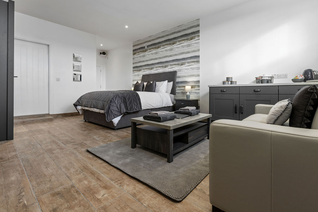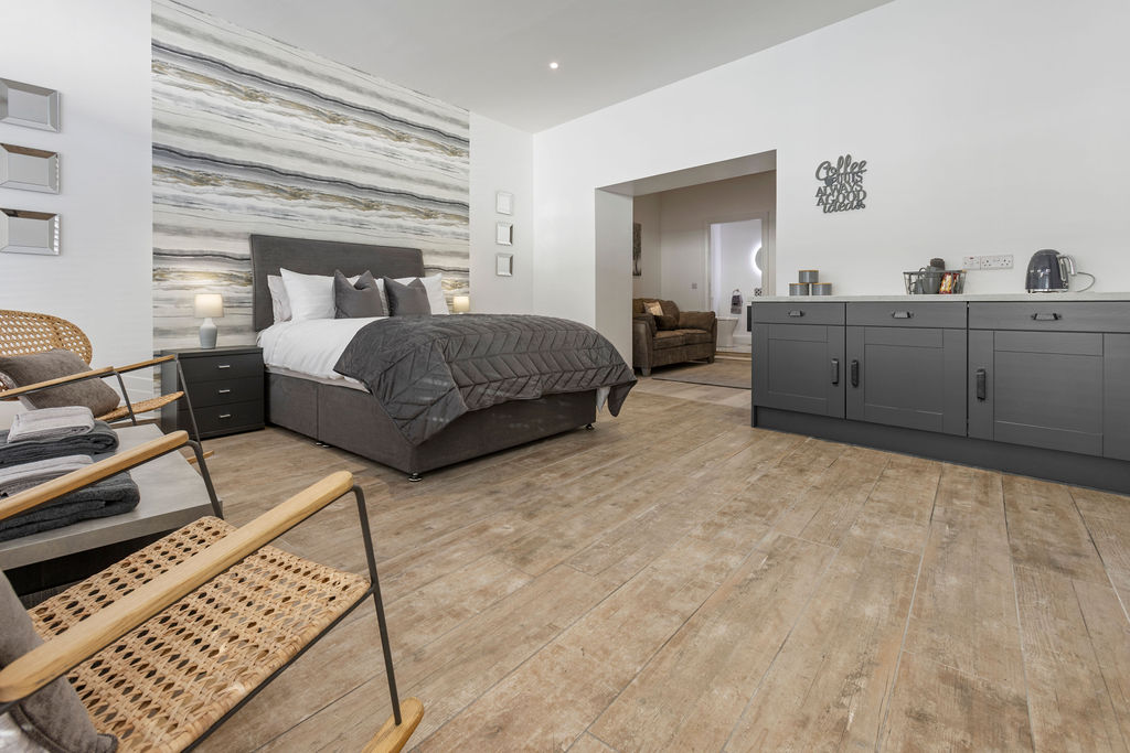 Bedroom/Living Space :- Includes tiled wooden effect flooring with up-stands. Range of units with granite effect worktops. Integrated fridge. Tea and coffee making area.