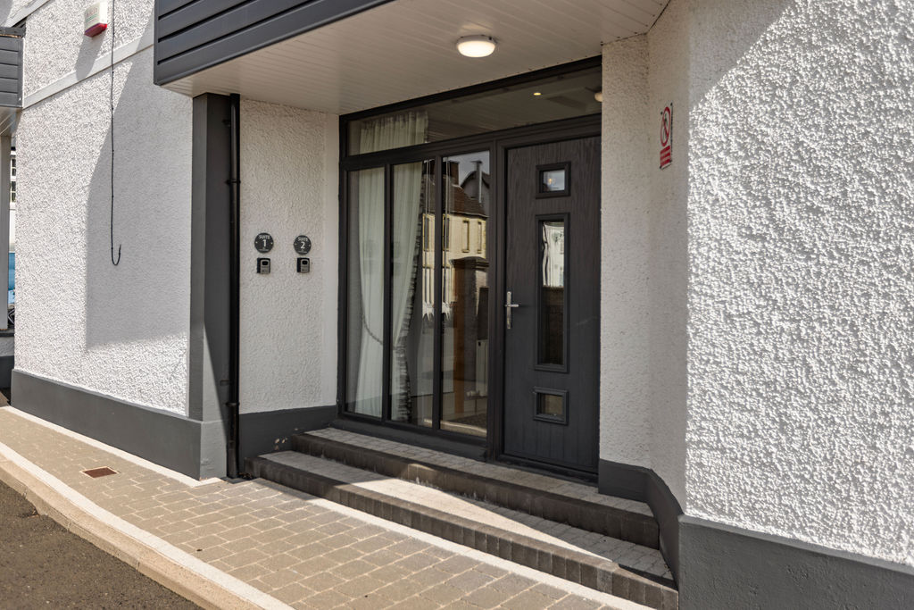 Entrance Area :- Porcelain tiled flooring leading to carpeted staircase. Access to First Floor Apartment and Four Ground floor units.