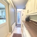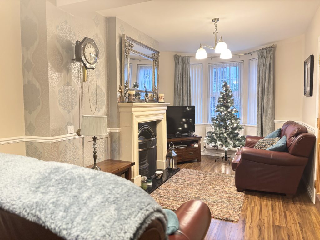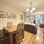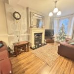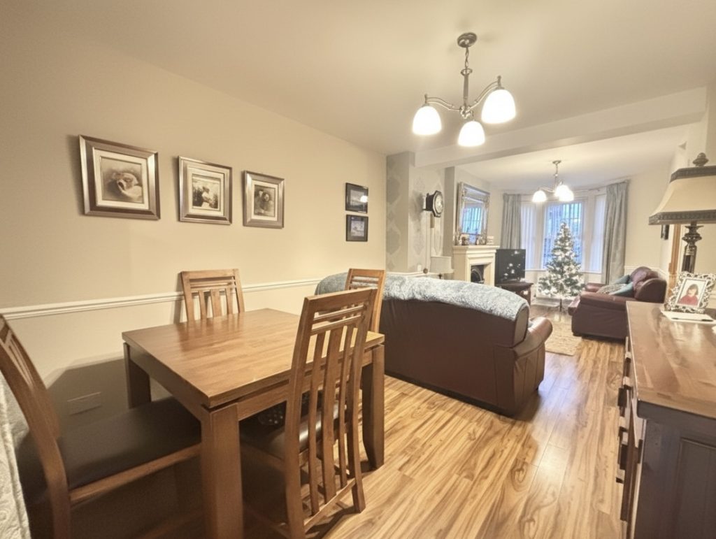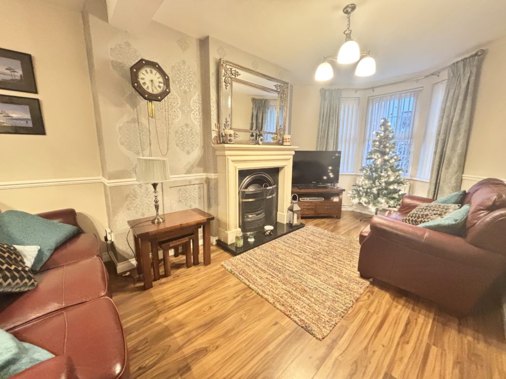 Lounge & Dining Area 7.4m x 3.1m (24’3” x 10’2”) :- Bay feature window with aspect to front. Adam style fireplace with tiled inset, hearth and mantlepiece. Dado rail with neutral painting. Wallpaper feature to fireplace. Laminate wooden flooring.