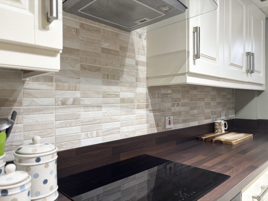 Kitchen 3.8m x 2.3m (12’6″ x 7’7″) :- Modern recently fitted kitchen with range of eye and low level shaker style units in cream. Wood effect worktops creating stylish contracts. Built in hob and oven with stainless steel extractor fan. Integrated dishwasher. Splash back tiling to kitchen. Tile effect flooring. Aspect to rear. One and a quarter bowl stainless steel sink unit and drainer.