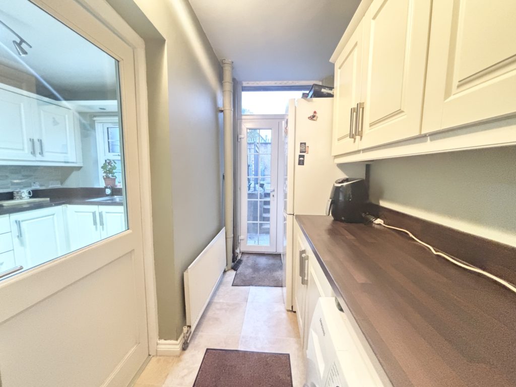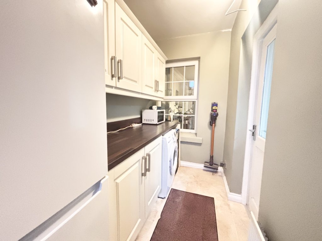 Utility Room 3.5m x 1.5m (12‘6” x 4‘11”) :- Accessed from kitchen and including range of matching eye and low level units in cream and matching wood effect worktop. Plumbed for washing machine. Space for fridge and freezer. Tile effect flooring.