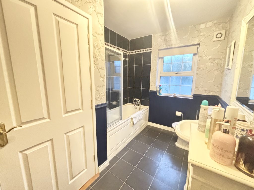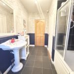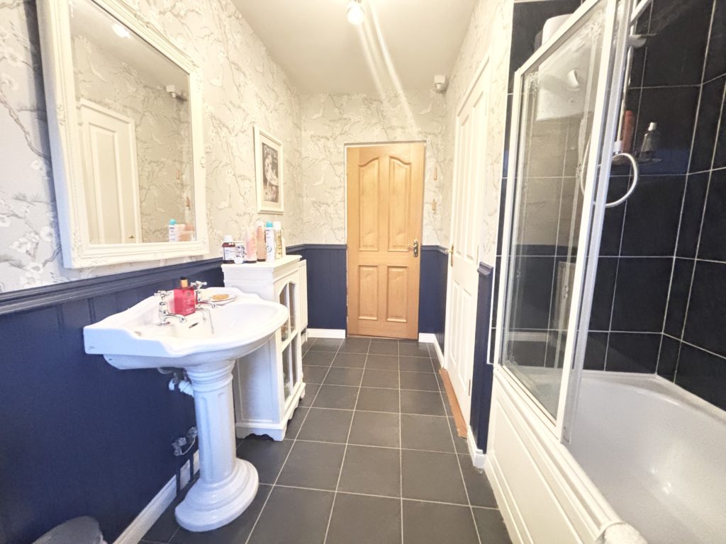 Bathroom 3.62m x 2.07m (11‘11” x 6‘9”) :- Include three piece white suite comprising of lfwc, whb and bath. Shower above bath with fitted screen. Mixer taps. Beadboard panelling with contrasting wallpaper. Hotpress off with shelved storage.