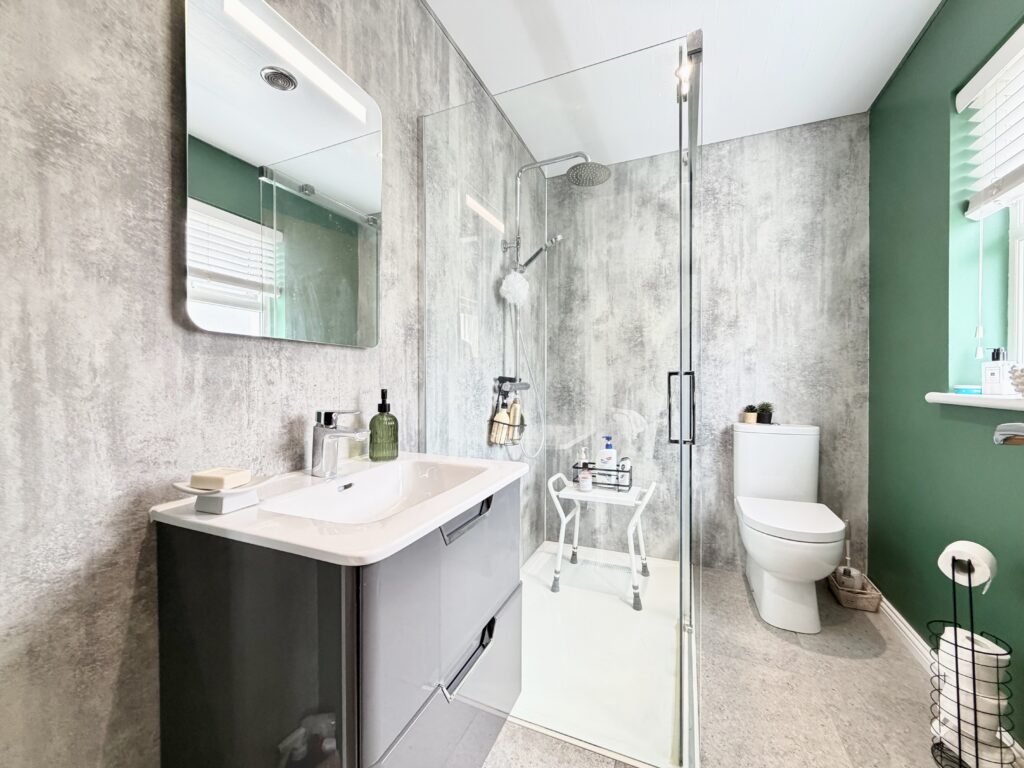 En-suite 2.46m x 1.68m (8’1” x 5’8”) :- Recently fitted suite comprising of quadrant walk in shower cubicle with chrome rainfall showerhead and separate handheld attachment, gloss grey vanity whb and unit and white lfwc. Grey PVC panelling.