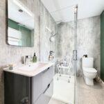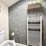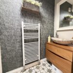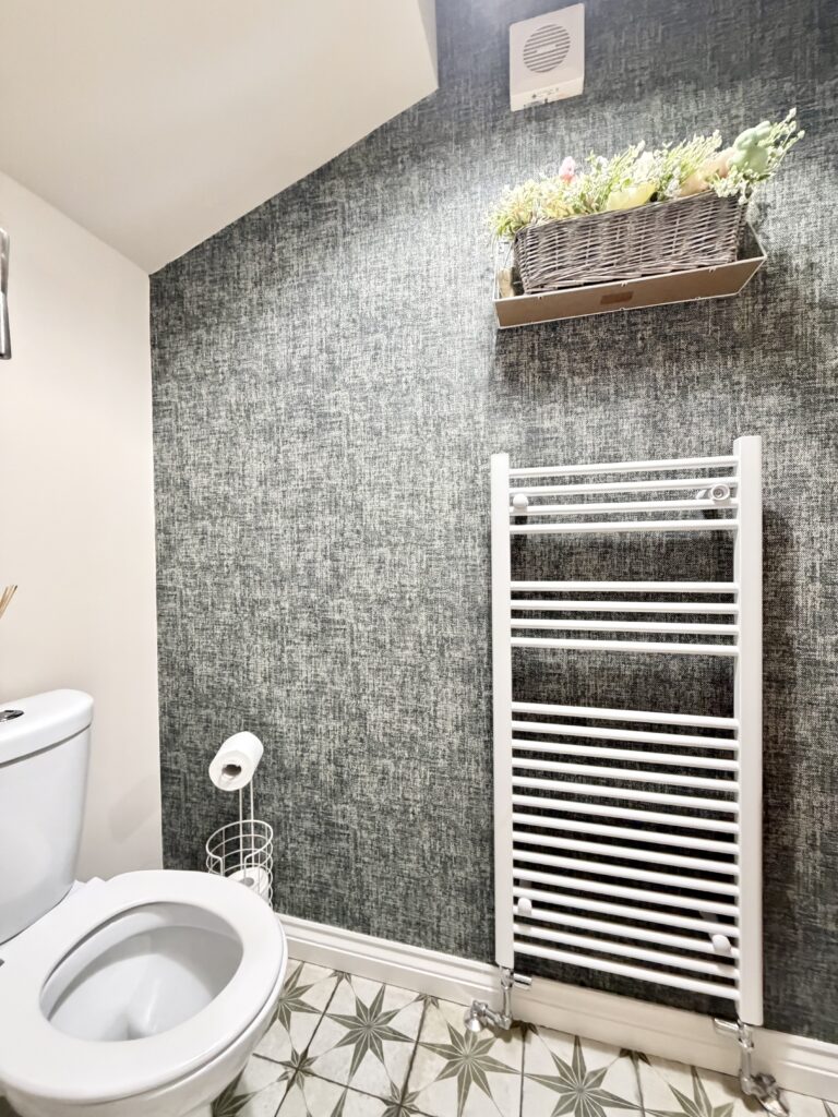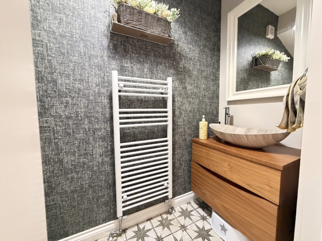 Cloakroom 2.18m x 0.94m (7’2” x 3’1”) :- Stylish and modern downstairs toilet with boutique styling. Tiled floor. Vanity whb and lfwc. Feature wall with grasscloth-effect wallpaper with contrasting grey and charcoal. Heated towel rail.