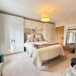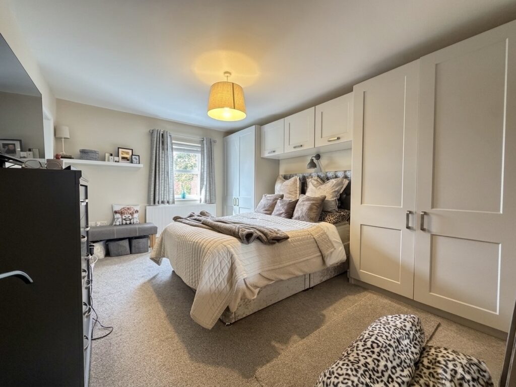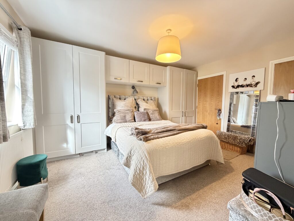 Bedroom 1 4.37m x 3.38m (14’4″ x 11’1″) :- Carpet laid. Bespoke fitted shaker style wardrobes in white. Walk-in storage cupboard with hanging-rail storage.