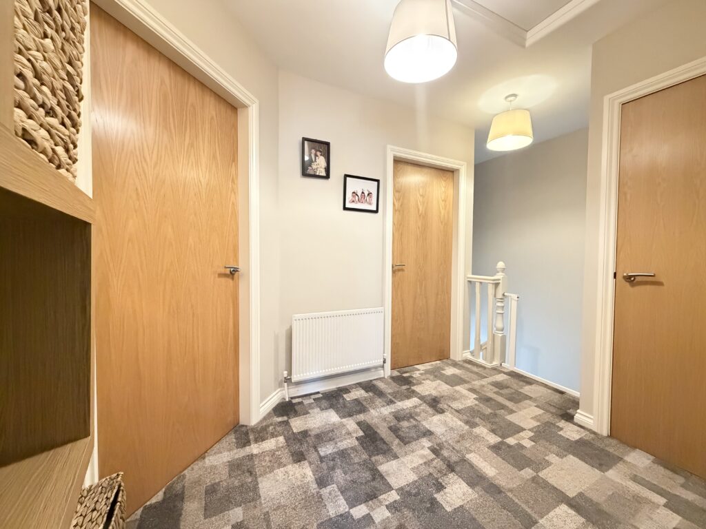 Landing :- Recently laid carpet with contrasting greys. Hotpress off with shelved storage.