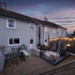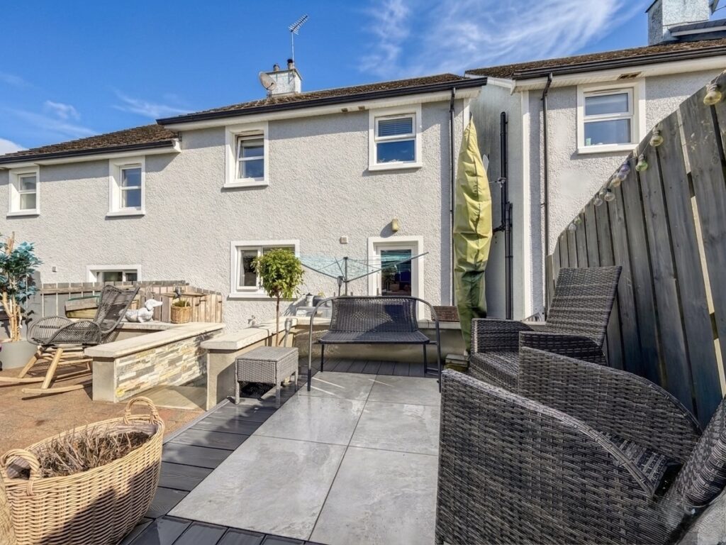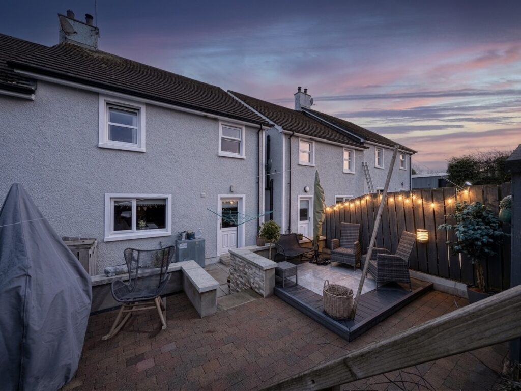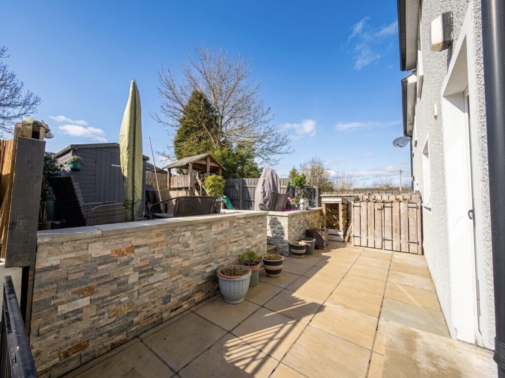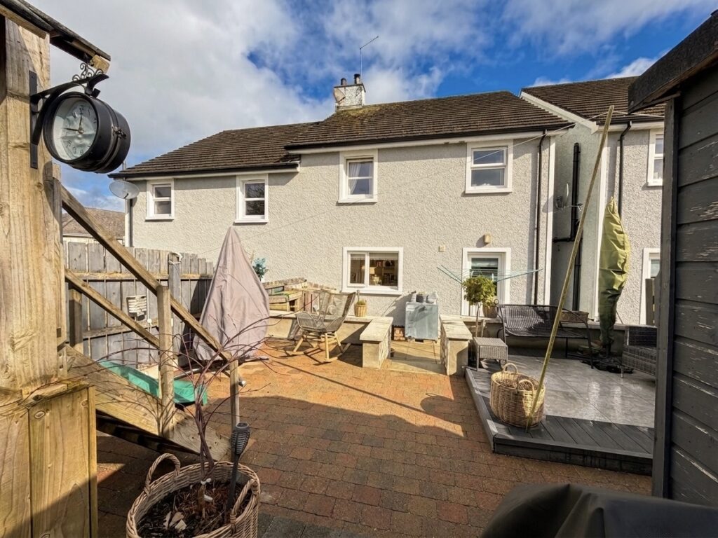 Rear :- Low maintenance patio areas on split level. Access via stairway with cladded stone effect wall. Recently laid patio area with contrasting red brick. Recently installed ‘sun deck’ perfect for outdoor seating and entertaining. Secured via cast iron gateway.
