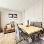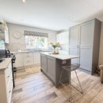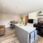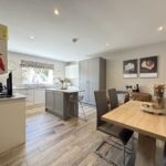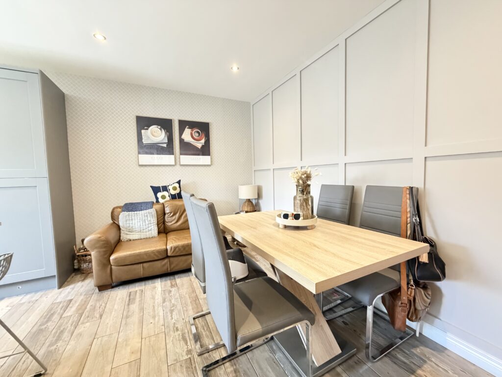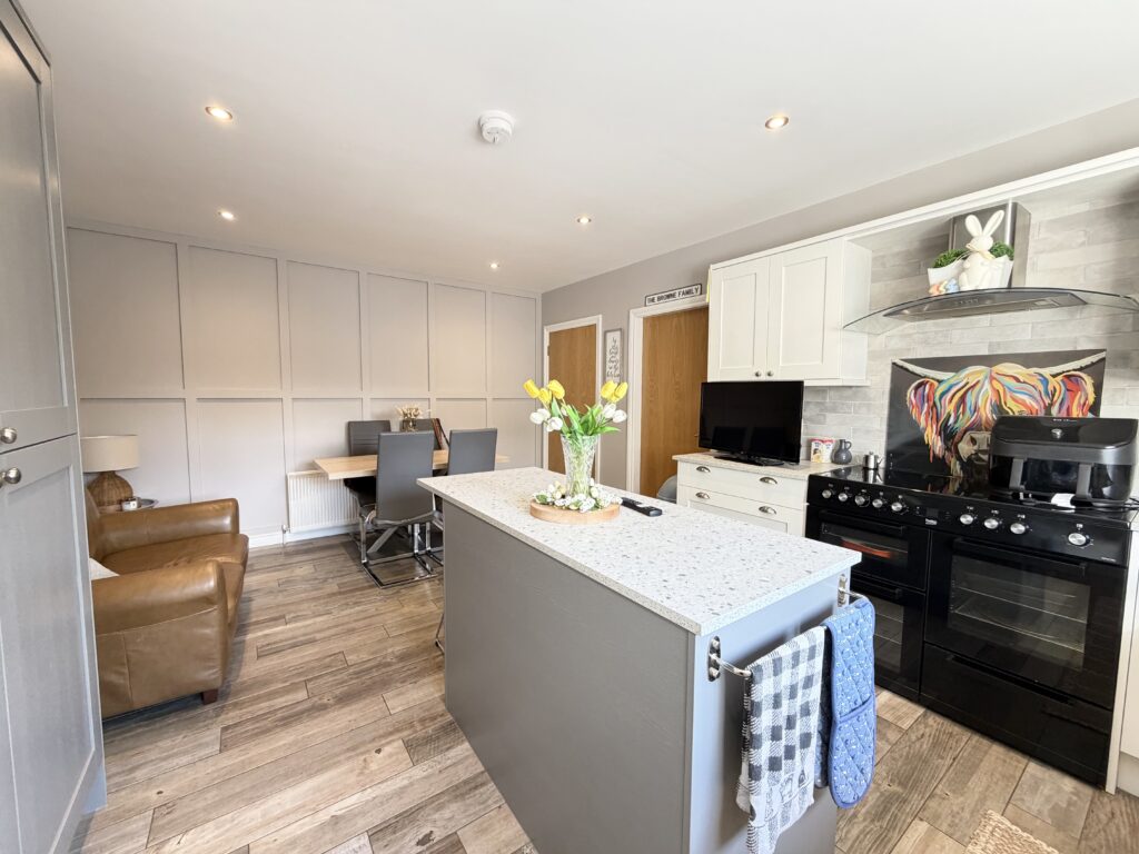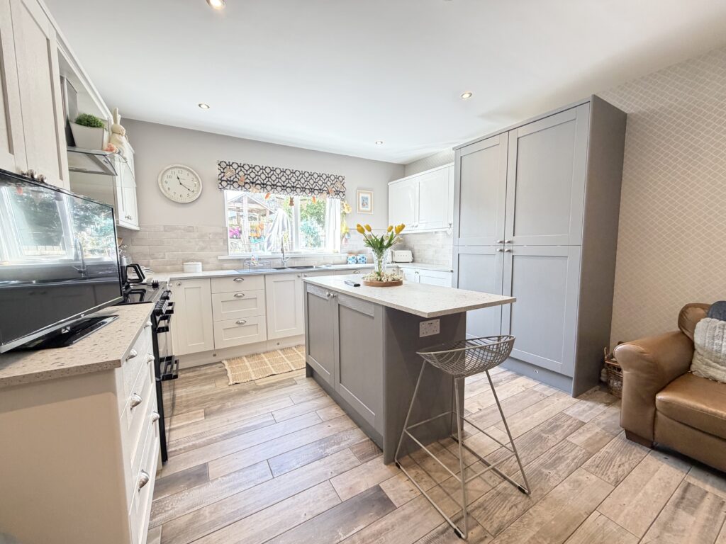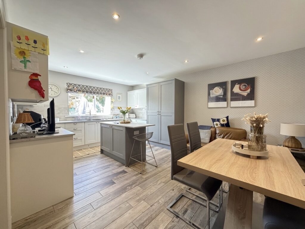 Kitchen/Dining 5.38m x 3.84m (17’8″ x 12’7″) :- Bright and modern open plan kitchen and dining area including contemporary range of shaker style eye and low level units in contrasting white and grey with matching island. Wood effect tiled flooring. Space for range style cooker. Integrated fridge. Integrated dishwasher. Recessed LED spotlights. Splash back tiling to kitchen. One and a quarter bowl stainless steel sink unit and drainer. Space for family dining and snug. Shaker panelling.