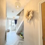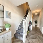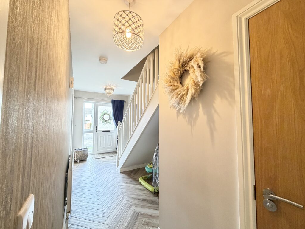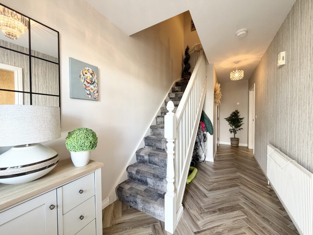 Hallway :- Welcoming entrance with grey oak style herringbone flooring. Feature contrasting grey papered wall. White solid wooden staircase.