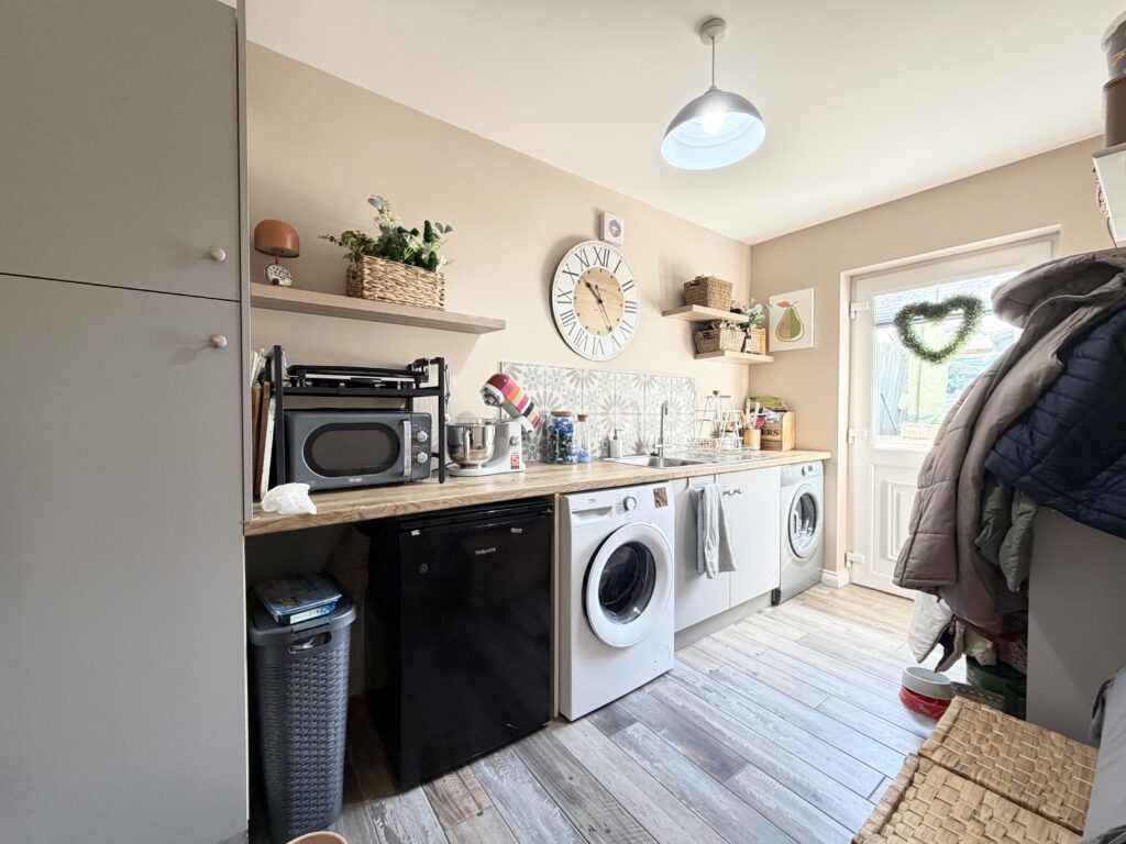 Utility room 4.01m x 2.03m (13’2” x 6’8”) :- Range of low level units with pantry style cupboard. Plumbed for washing machine and space for tumble drier. Space for freezer. One and a quarter bowl stainless steel sink unit. Mosaic splash back tiling to sink unit and drainer.