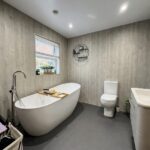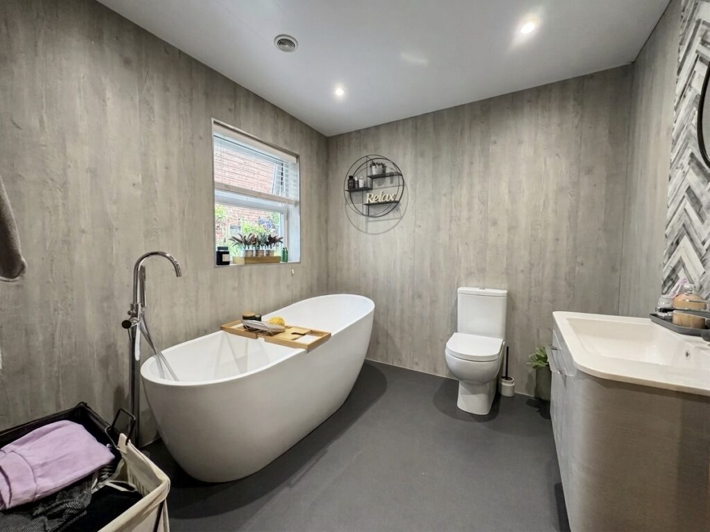 Bathroom 2.57m x 2.46m (8’5″ x 8’1″) :- Includes white contemporary three piece suite comprising lfwc, contemporary vanity whb and free-standing oval bath. Chrome accessories including bath fittings. Contemporary heated towel rail. Fully panelled walls. Spotlights.