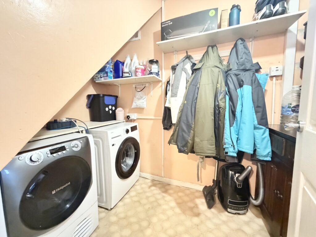 Utility 2.5m x 1.7m (8‘2” x 5‘7”) :- Plumbed for washing machine and space for tumble dried. Cloak storage and shelved storage.