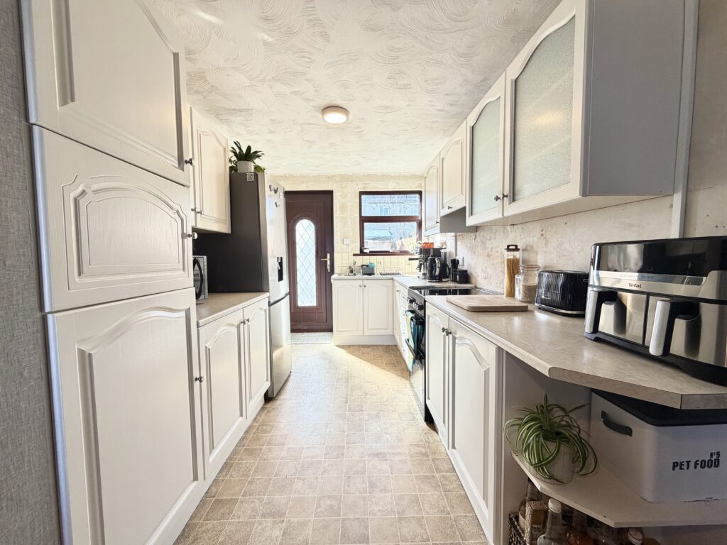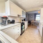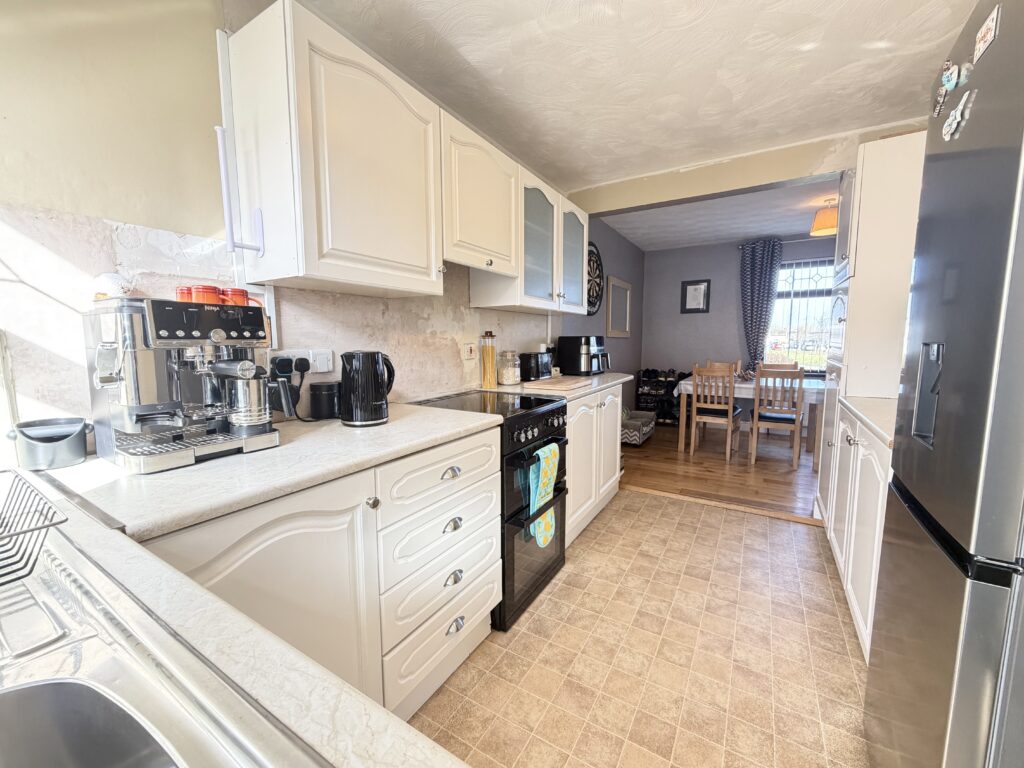 Kitchen 3.7m x 2.4m (12‘2’’ x 7’10’’) :- Includes range of eye and low level solid wooden units in creme. Stone effect worktops. Tile effect flooring. Built in hob and oven with extractor fan above. Space for fridge and freezer. Access to rear..