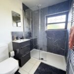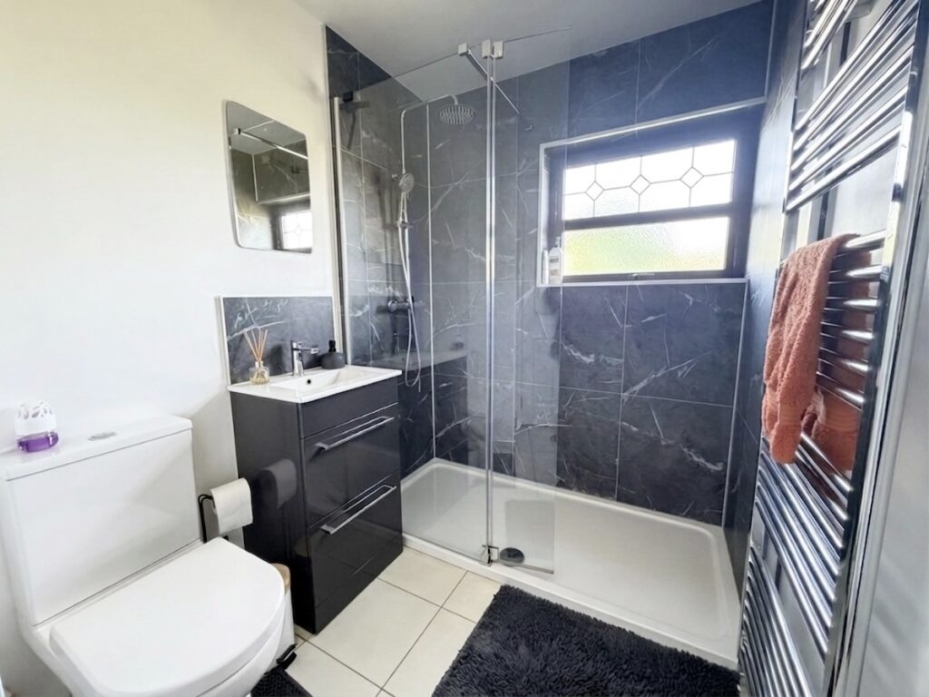 Bathroom 2.7m x 1.72m (8’10’’ x 5’7’’) :- Recently installed suite comprising of walk in shower, vanity whb and lfwc. Tiled flooring. PVC panelling to shower. Chrome heated towel rail.