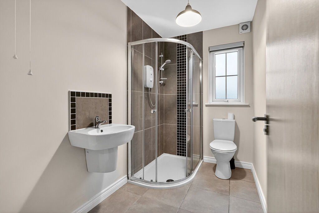 Ensuite 2.77m x 1.55m (9‘1” x 5‘1”) :- White suite comprising quadrant corner shower cubicle, lfwc and whb. Tiled walls to shower and splash back tiling to whb. Tiled floor. Spotlights.