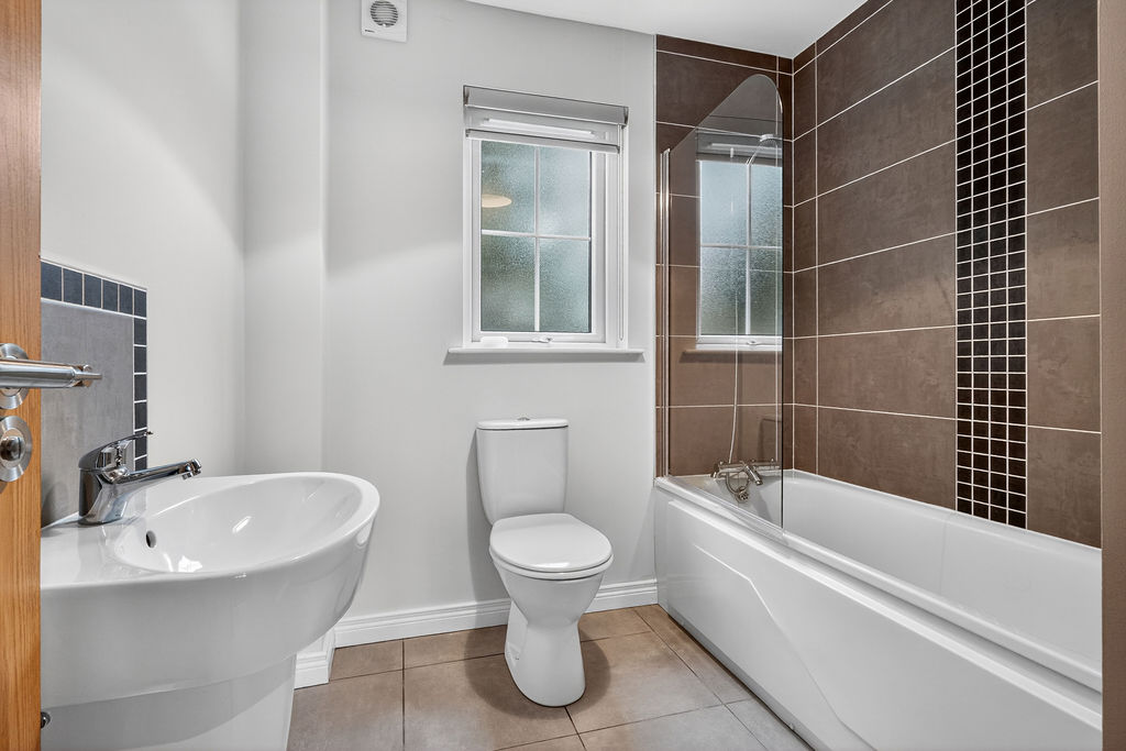 Bathroom 2.36m x 2.34m (7’9’’ x 7’8’’) :- Includes white suite comprising lfwc, whb and bath. Shower over bath with glass screen. Tiled flooring. Tiled to bath. Tiled to whb.