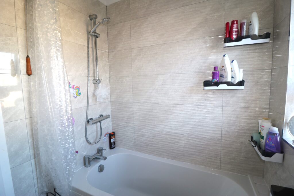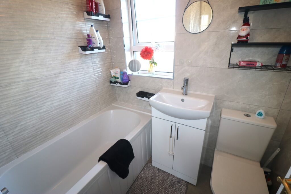 Bathroom 1.88m x 1.57m (6’2″ x 5’2″) :- Includes white three piece suite comprising lfwc, vanity whb and bath. Chrome accessories including shower attachment to bath. Fully tiled walls and flooring.