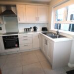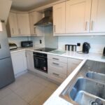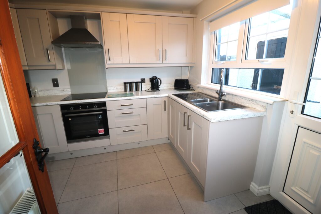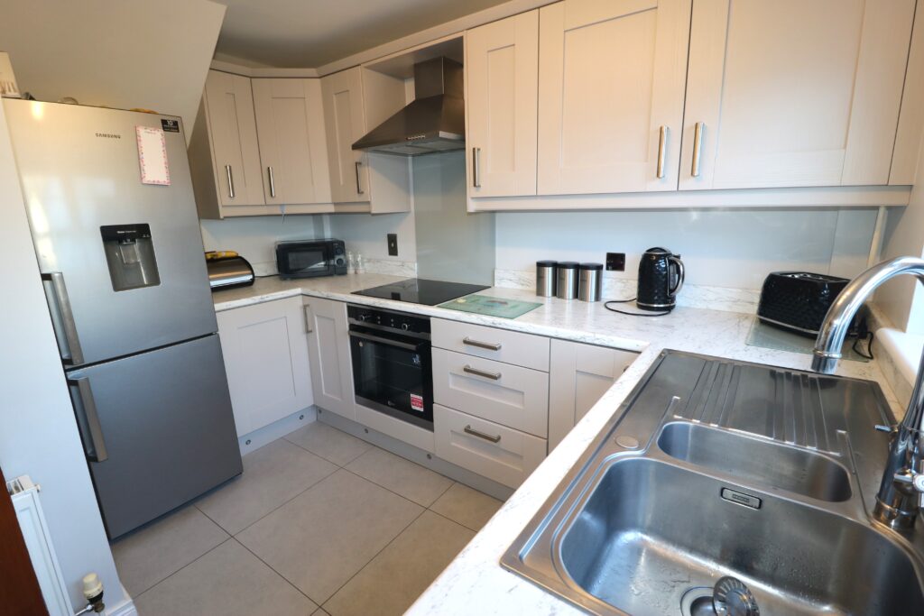 Kitchen 3.17m x 2.72m (10’5″ x 8’11”) :- Includes range of eye and low level Shaker style units in grey with chrome. One and a quarter bowl stainless steel sink unit. White granite effect worktops and up-stands. Built in hob and oven. Glass splash back. Stainless steel extractor fan.  Space for fridge/freezer. LED lighting to kickboards. Tiled flooring.