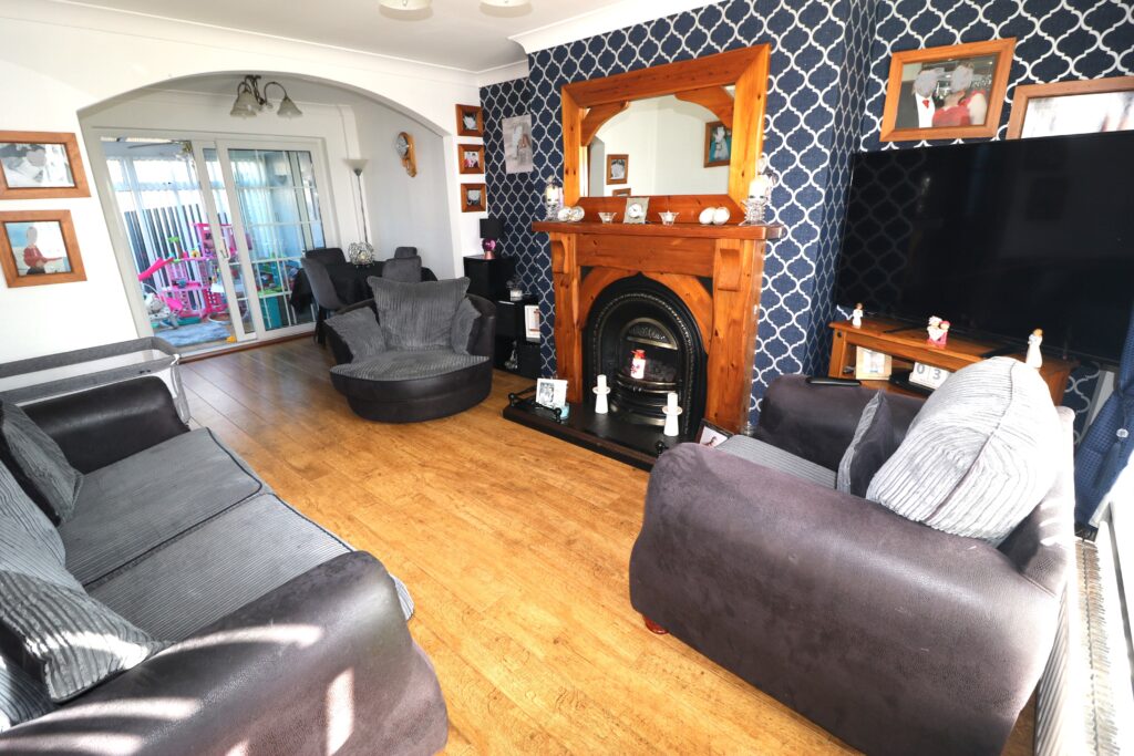 Lounge 3.97m x 3.53m (13’0” x 11’7”) :- Includes Adam style fireplace with cast iron inset and slate tiled hearth. Laminate wooden flooring. Open to Dining area.