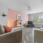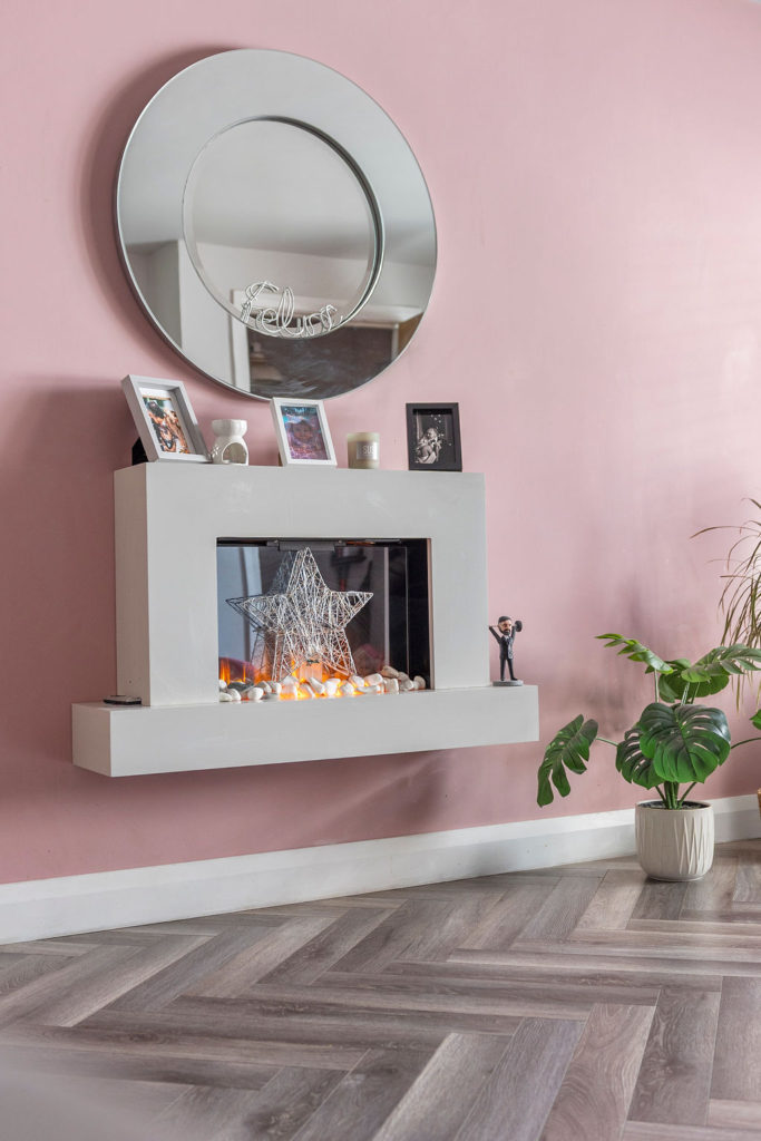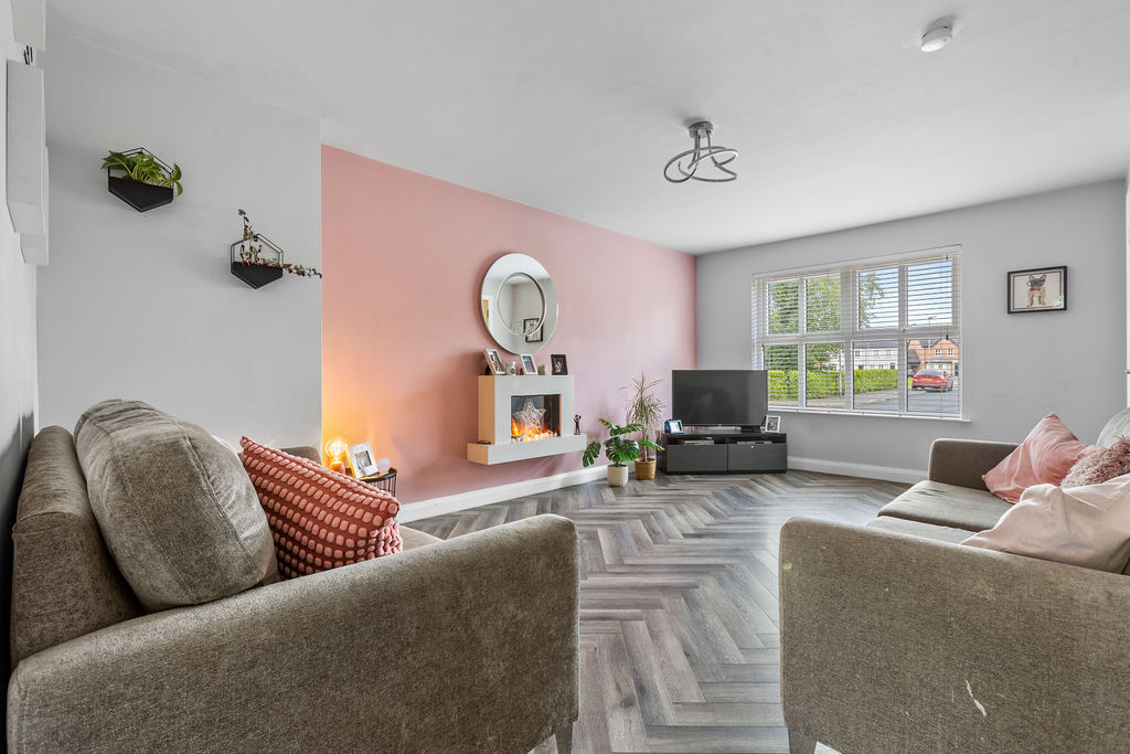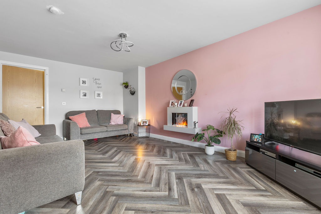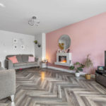 Lounge 5.5m x 3.6m (18’0” x 11’11”) :- Herringbone style laminate wooden flooring finished in smoked oak effect. ‘Floating’ electric wall mounted fire to centre. Aspect to front.