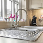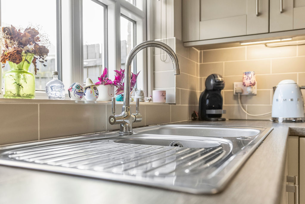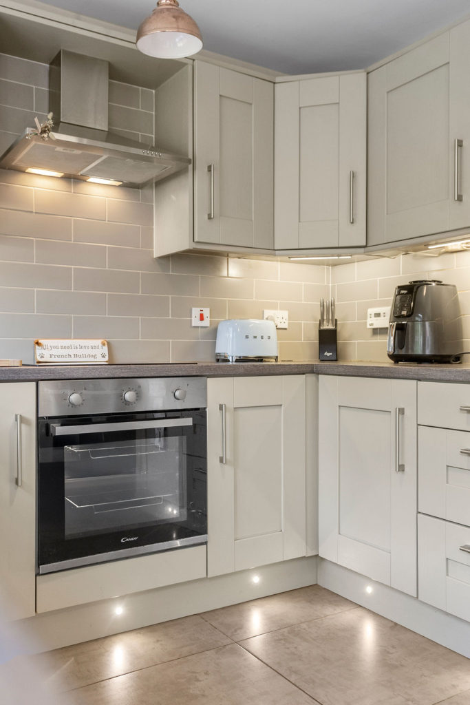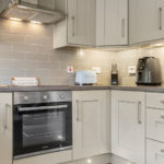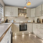 Kitchen 2.8m x 2.6m (9’2” x 8’7”) :- Range of contemporary eye and low level units in grey shade. Space for washing machine and drier. Integrate fridge and freezer. Built in hob and oven. Stainless steel extractor fan. One and a quarter bowl stainless steel sink unit and drainer with mixer tap.  Contemporary tiled floor.