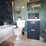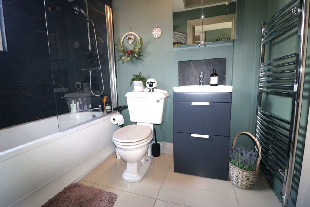 Bathroom 2.37m x 1.73m (5’6″ x 5‘2″) :- Includes white three piece suite comprising lfwc, vanity whb and bath. Splash back tiling to whb, fully tiled to bath. Chrome accessories including shower over bath. Chrome heated towel rail. Porcelain tiled flooring. Storage Hotpress off.