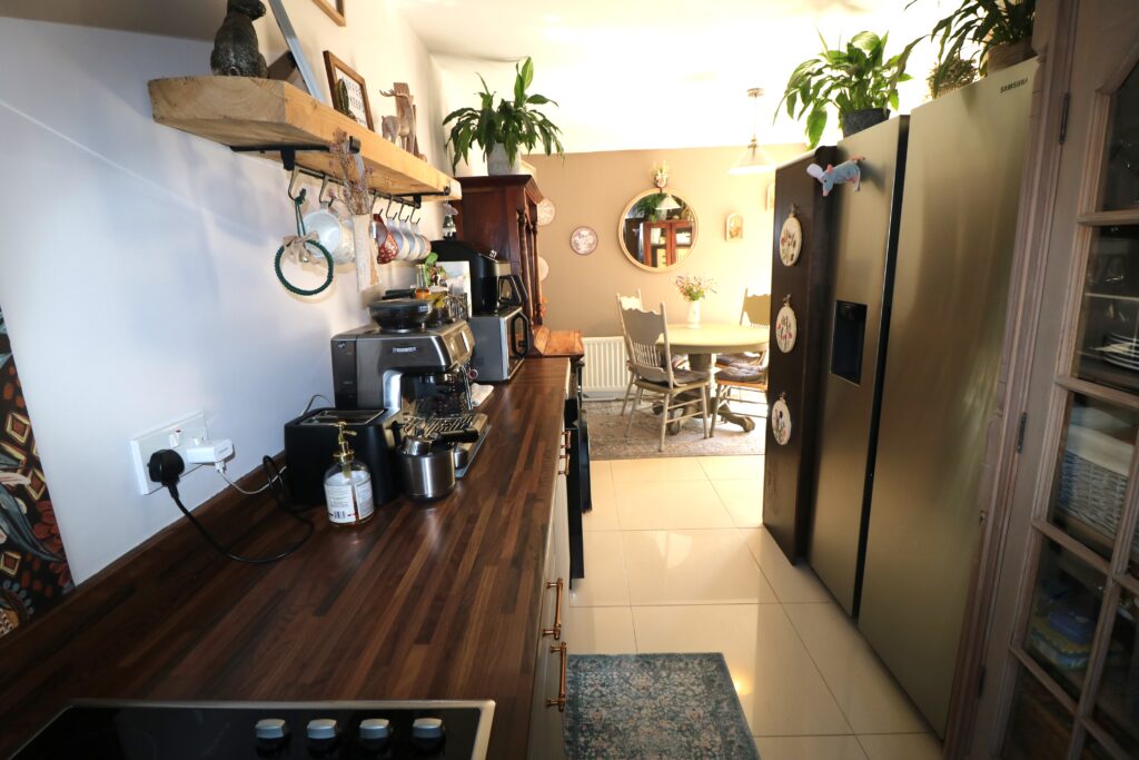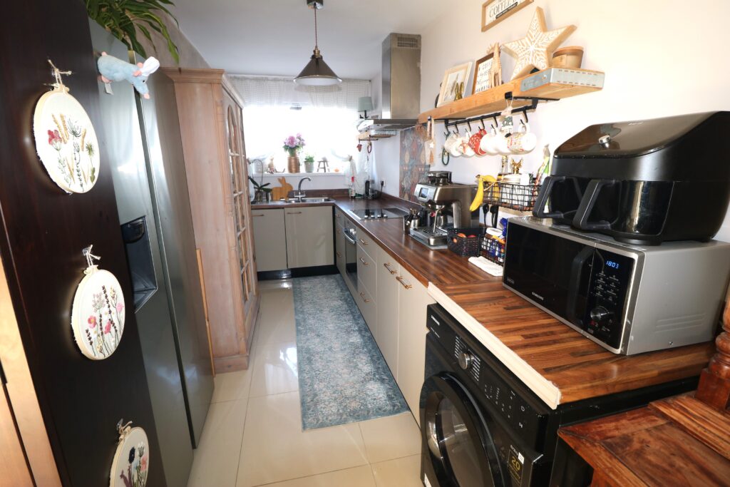 Kitchen includes range of eye and low level units. One and a quarter bowl stainless steel sink unit. Wooden effect worktops and up-stands. Built in hob and oven. Stainless steel extractor fan. Patterned splash back tiling. Integrated fridge/freezer. Porcelain tiled flooring.