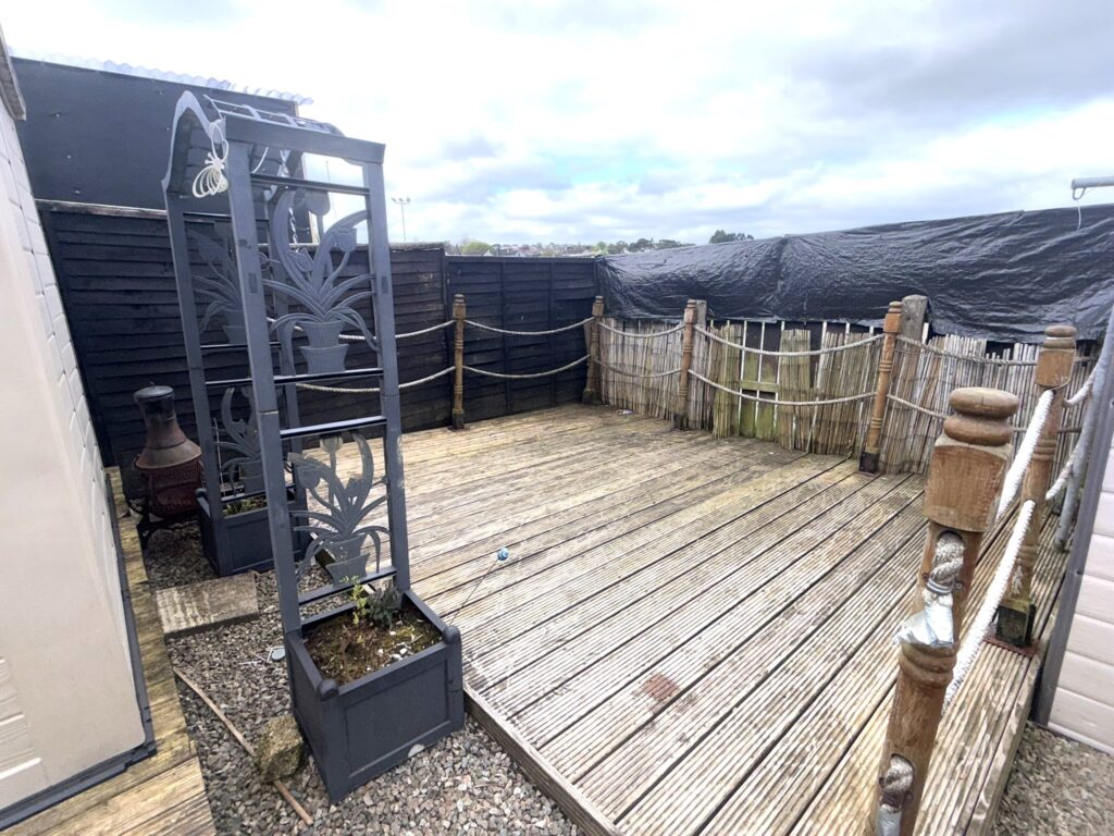 Rear :- Laid in decorative stone. Decked area. Fully enclosed.