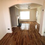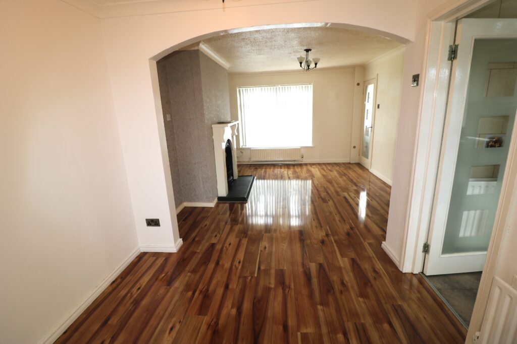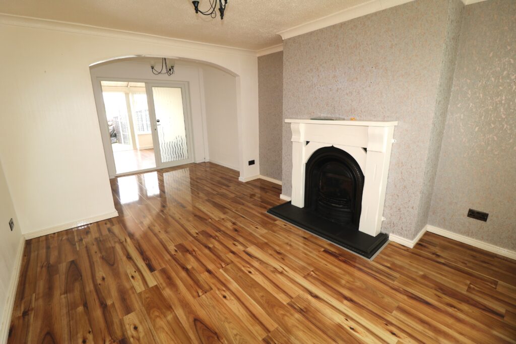 Lounge 3.97m x 3.53m (13’0” x 11’7”) :- Includes Adam style fireplace with cast iron inset and slate tiled hearth. Laminate wooden flooring. Open to Dining area.