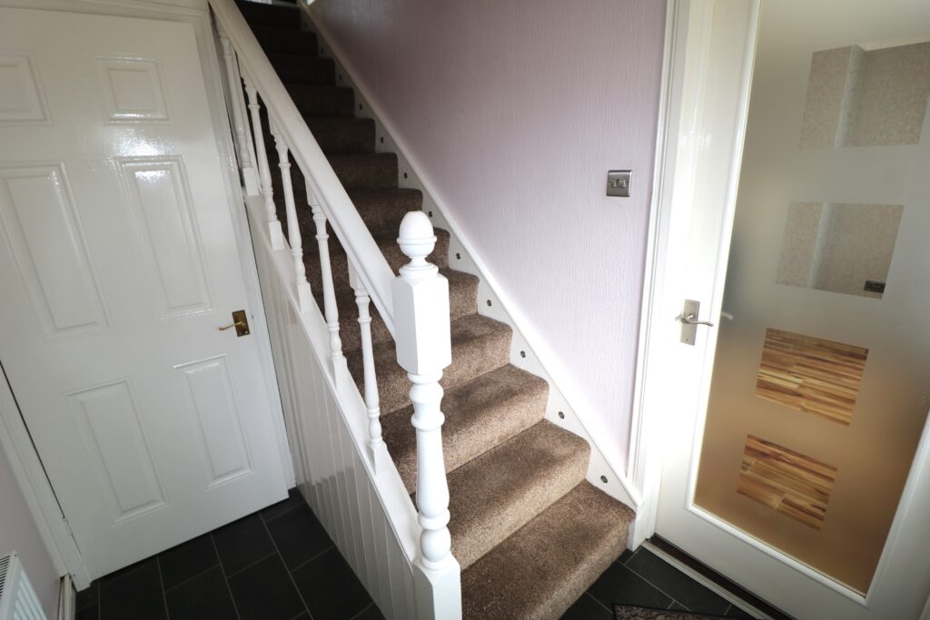 Hallway :- Balustrade staircase. Glass panelled door to Lounge.