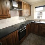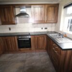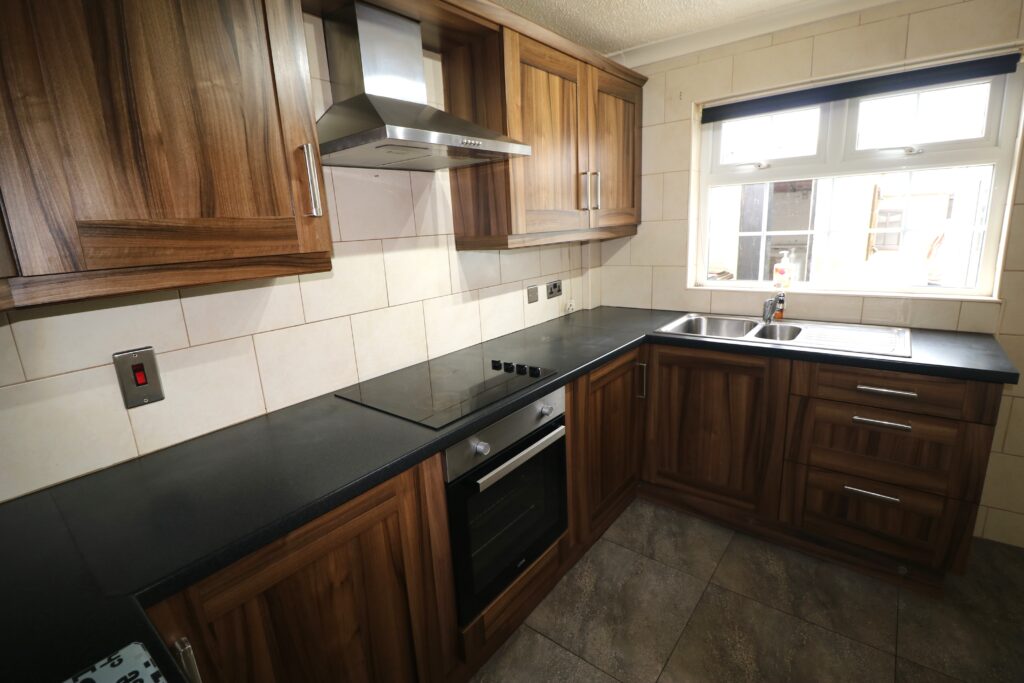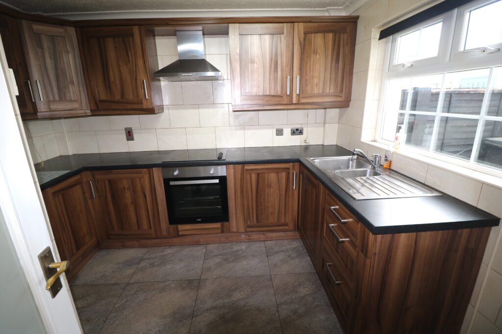 Kitchen 3.17m x 2.72m (10’5″ x 8’11”) :- Includes range of eye and low level Shaker style units in walnut effect and chrome. One and a quarter bowl stainless steel sink unit. Granite effect worktops. Built in hob and oven. Stainless steel extractor fan.  Space for fridge/freezer. Fully tiled walls. Tiled flooring.