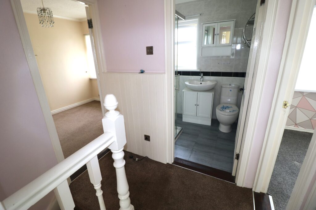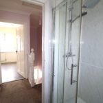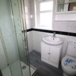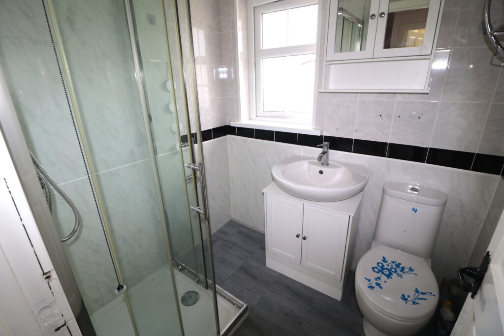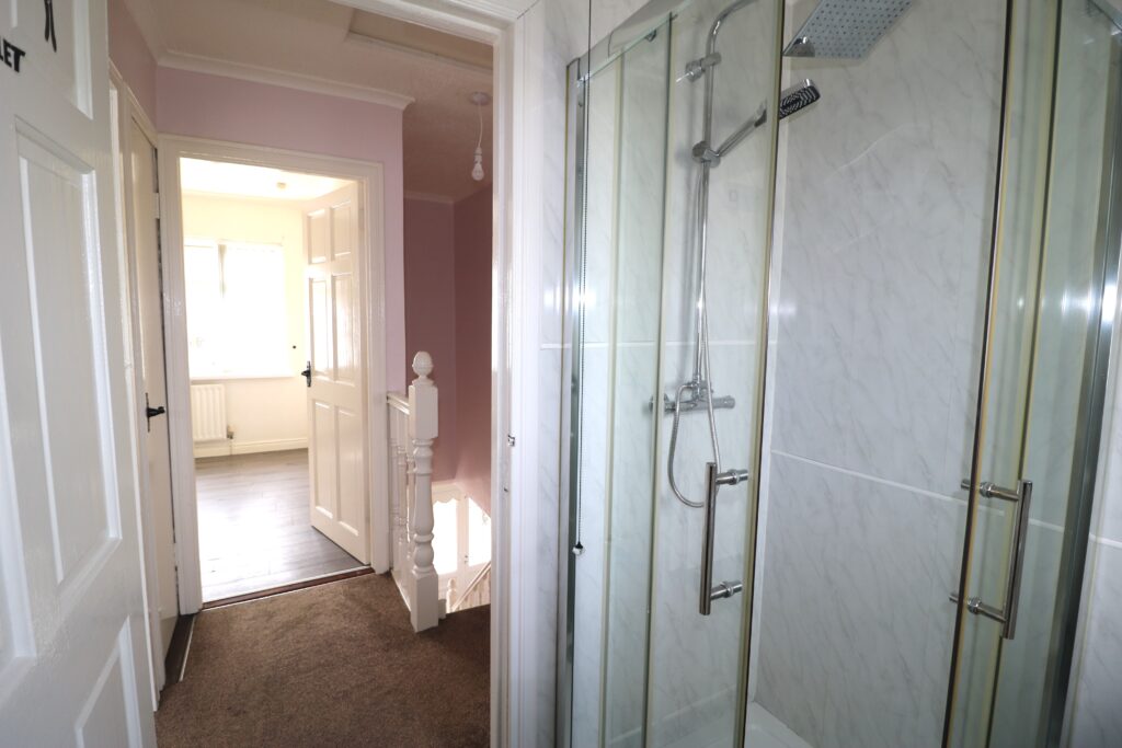Bathroom 1.88m x 1.57m (6’2″ x 5’2″) :- Includes white lfwc and whb. Fully panelled shower unit. Chrome accessories including Rain shower head and separate attachment. Half panelled, half tiled walls.