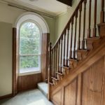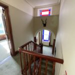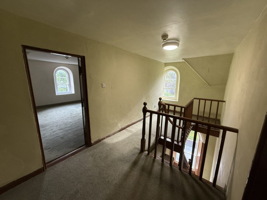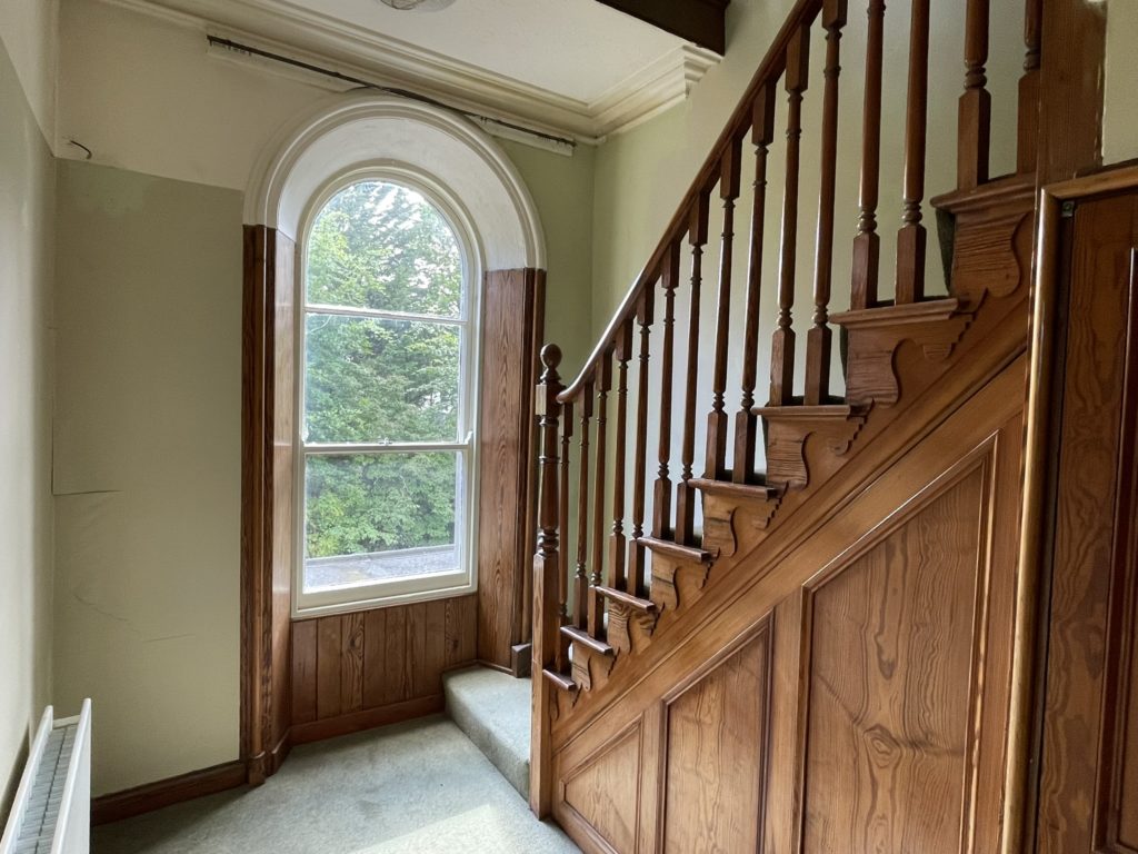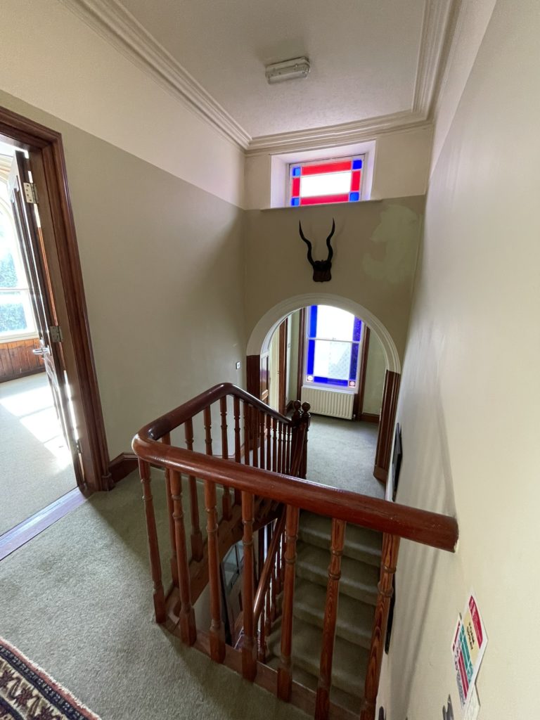 LANDING :- Ceiling cornicing. Stained glass windows. Storage cupboard off.