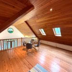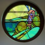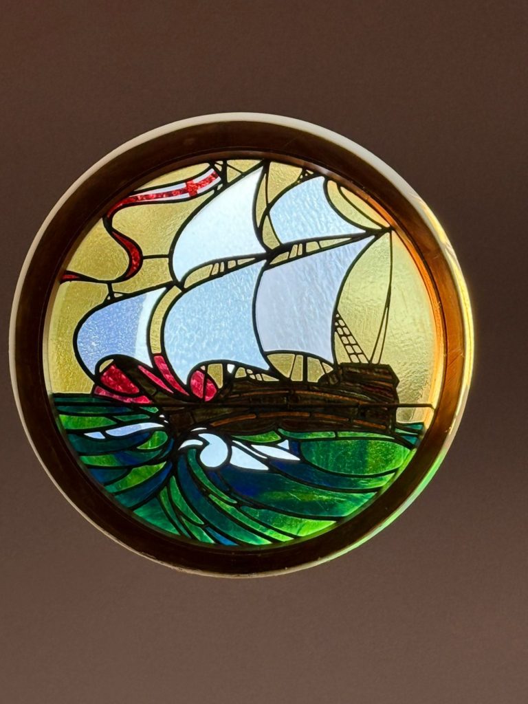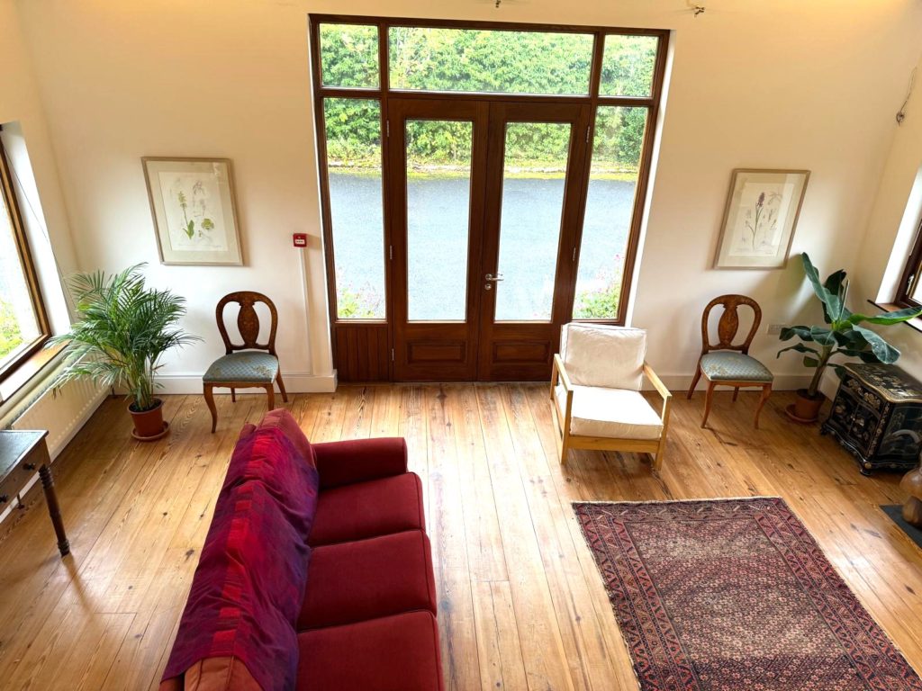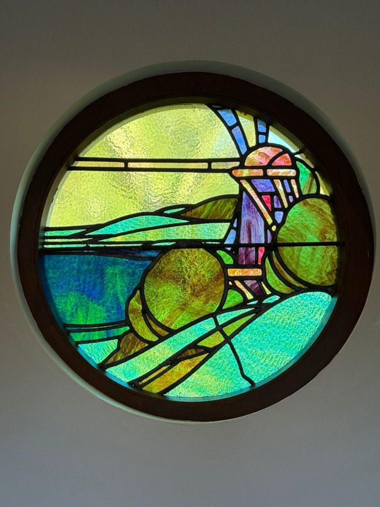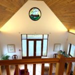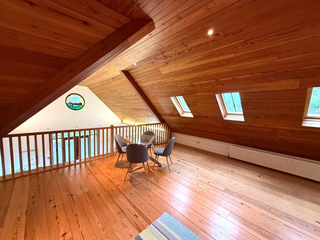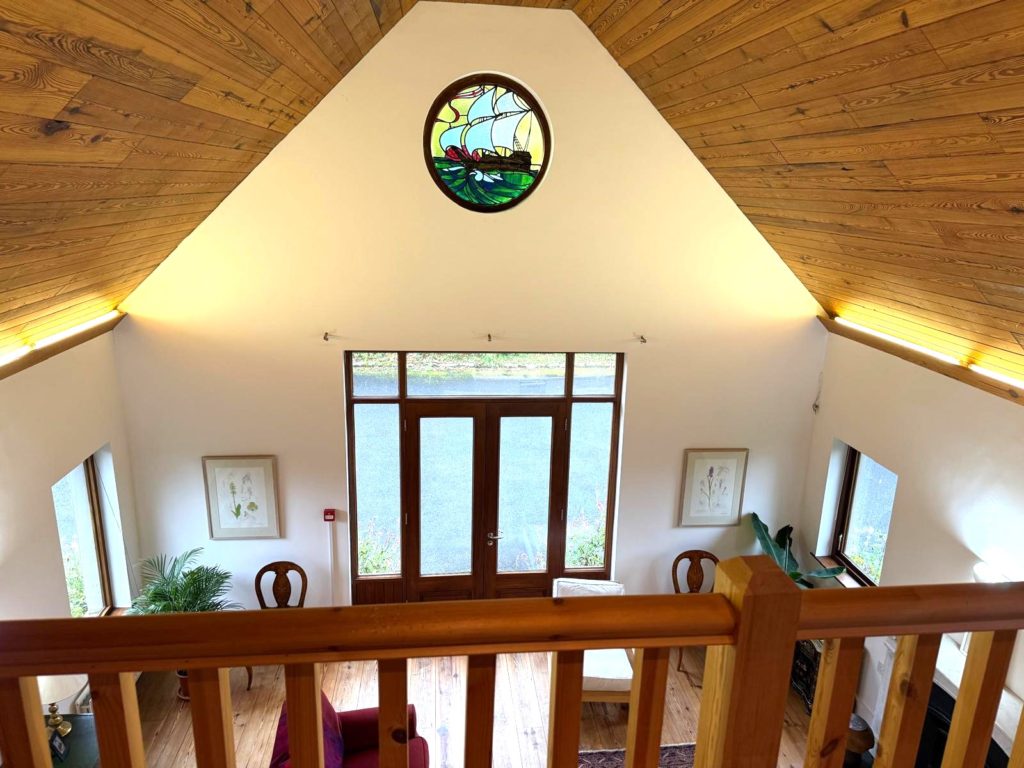 MEZANNINE GALLERY LANDING 6.00m X 5.90m (19’8” x 19’4”) :- Reclaimed wooden flooring. Panelled ceiling with spotlights. Circular windows with nautical themed stained glass.