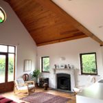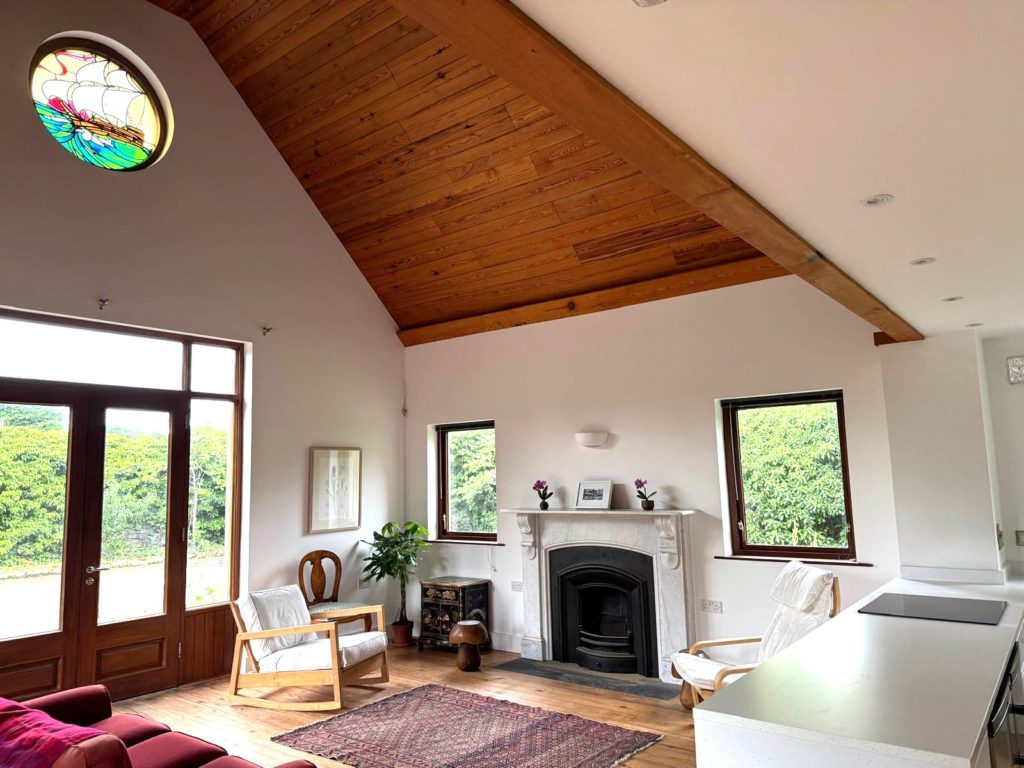 LOUNGE :- Reclaimed wooden flooring. Antique marble fireplace with cast iron inset and slate tiled hearth. Double patio doors to rear. Vaulted ceiling with wooden panelled. Feature circular stained glass window.