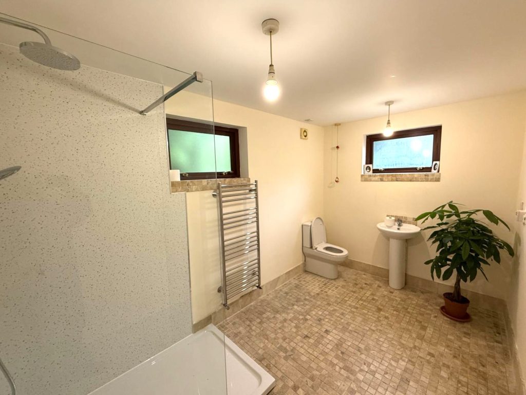 SHOWER ROOM 3.66m x 2.18m (12’0” x 7’2”) :- Includes white lfwc and whb with mosaic splash back tiling. Panelled double shower cubicle with Rain head and separate attachment. Travertine marble flooring.