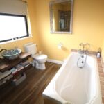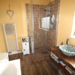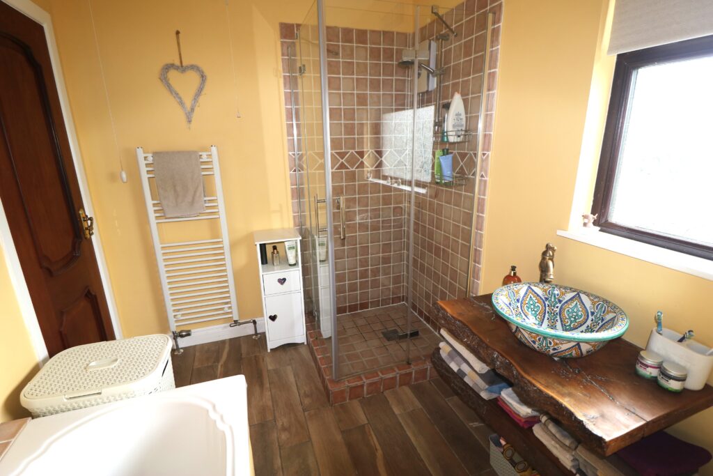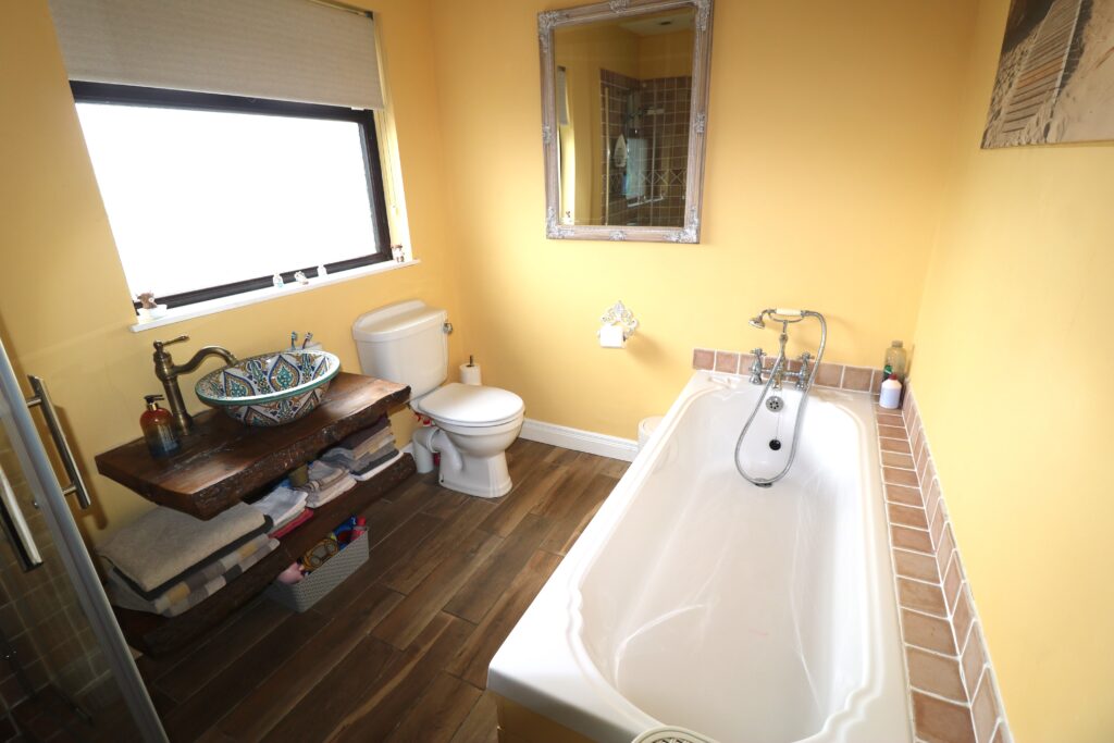 Bathroom 2.91m x 2.11m (9’6’’ x 6’11’’) :- Includes white three piece suite comprising lfwc, ceramic whb on wooden plinth, and bath. Fully ceramic tiled shower cubicle with electric shower. Ceramic tiled splash back to bath. Chrome accessories including shower attachment to bath. Heated towel rail. Wooden effect tiled flooring.