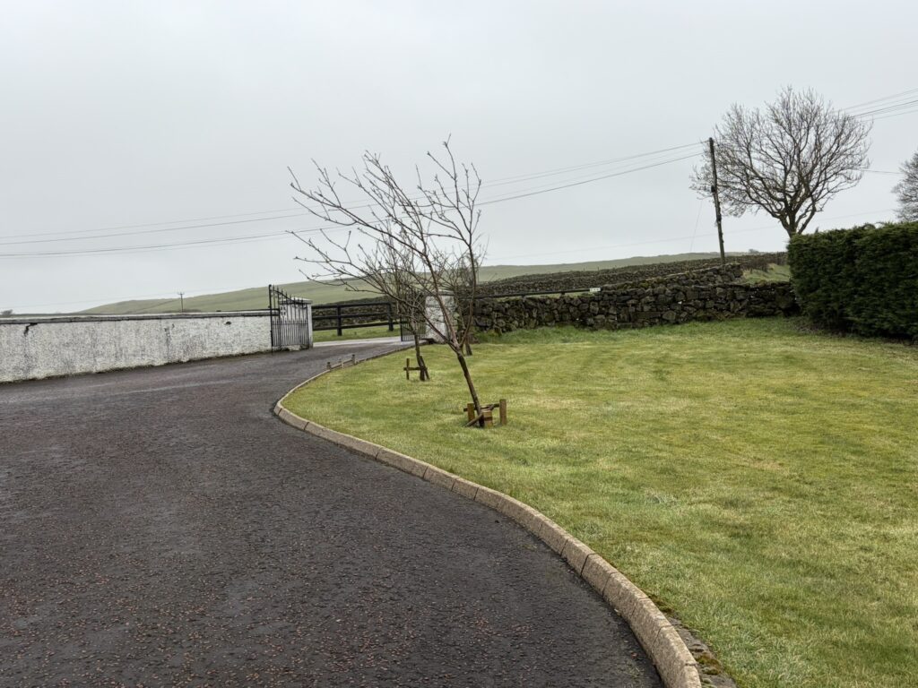 Front :- Asphalt parking area. Laid in lawn with brick pavia area. Enclosed with evergreen hedges.