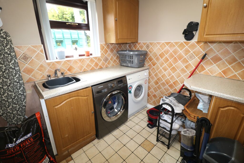 Utility room 2.60m x 2.32m (8’6” x 7’7”) :- Includes eye and low level units. Stainless steel sink unit. Plumbed for washing machine. Space for dryer. Tiled flooring.